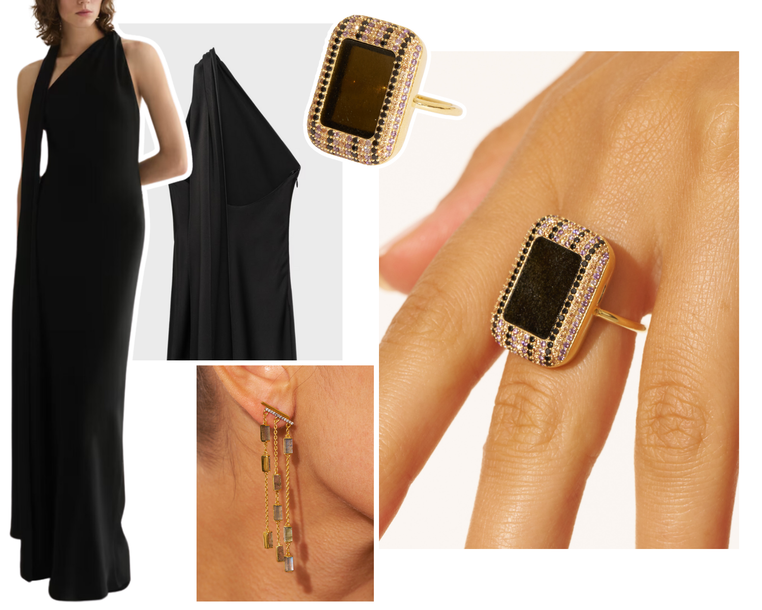 Get ready to capture and play with the light! The Dona ring , with its majestic central stone and broad silhouette, embodies a charming boldness. If you like subtle details, the Amenza earrings , with their refined sparkle, illuminate the face without overdoing it. For a more pronounced effect, the Idylle earrings , long and geometric, add a touch of sophistication and movement.