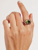 With its sculpted stripes and faceted center stone, the Zèbre ring highlights the art of contrast. Between light and dark rows, its alternating lines and openwork shape give it a unique character.