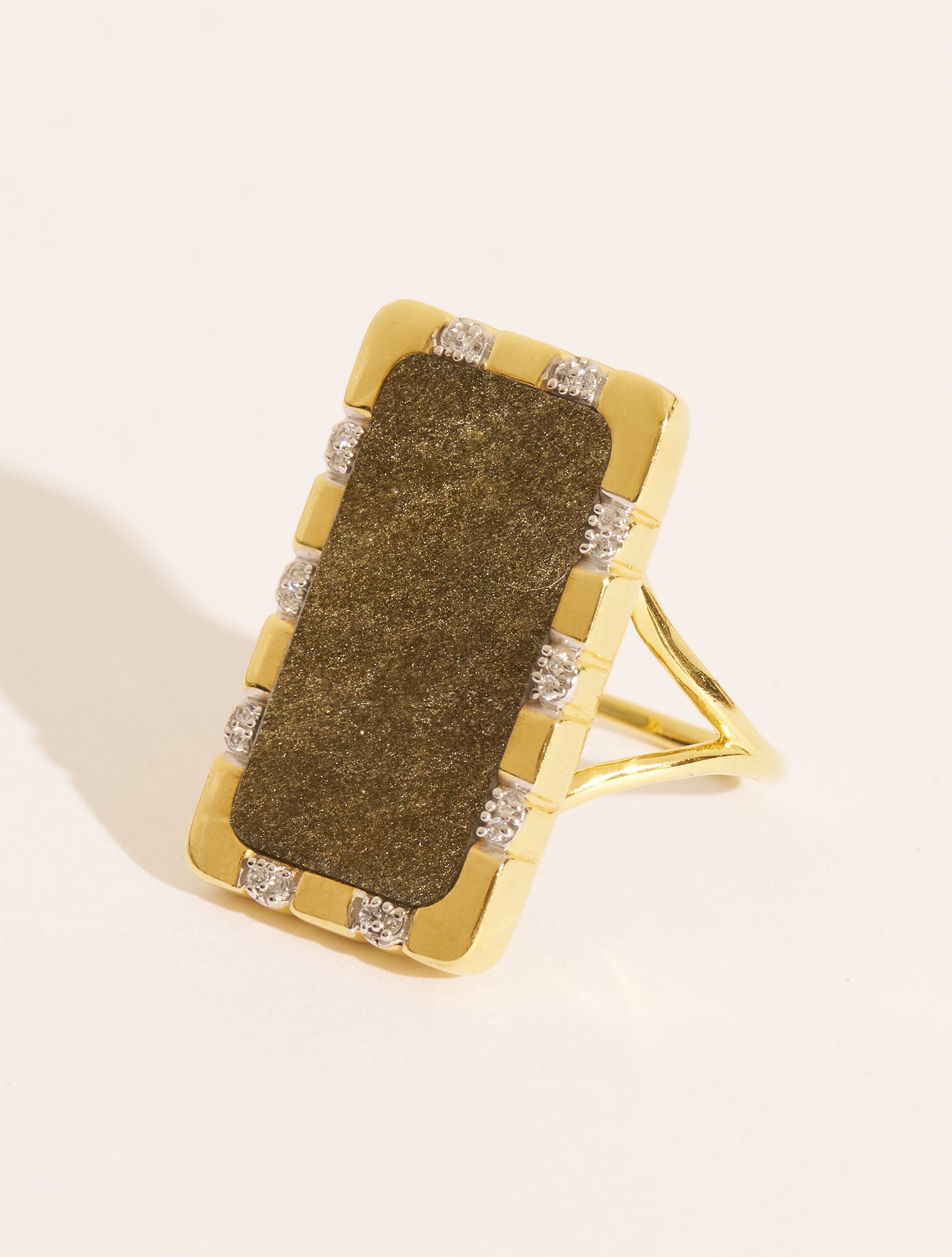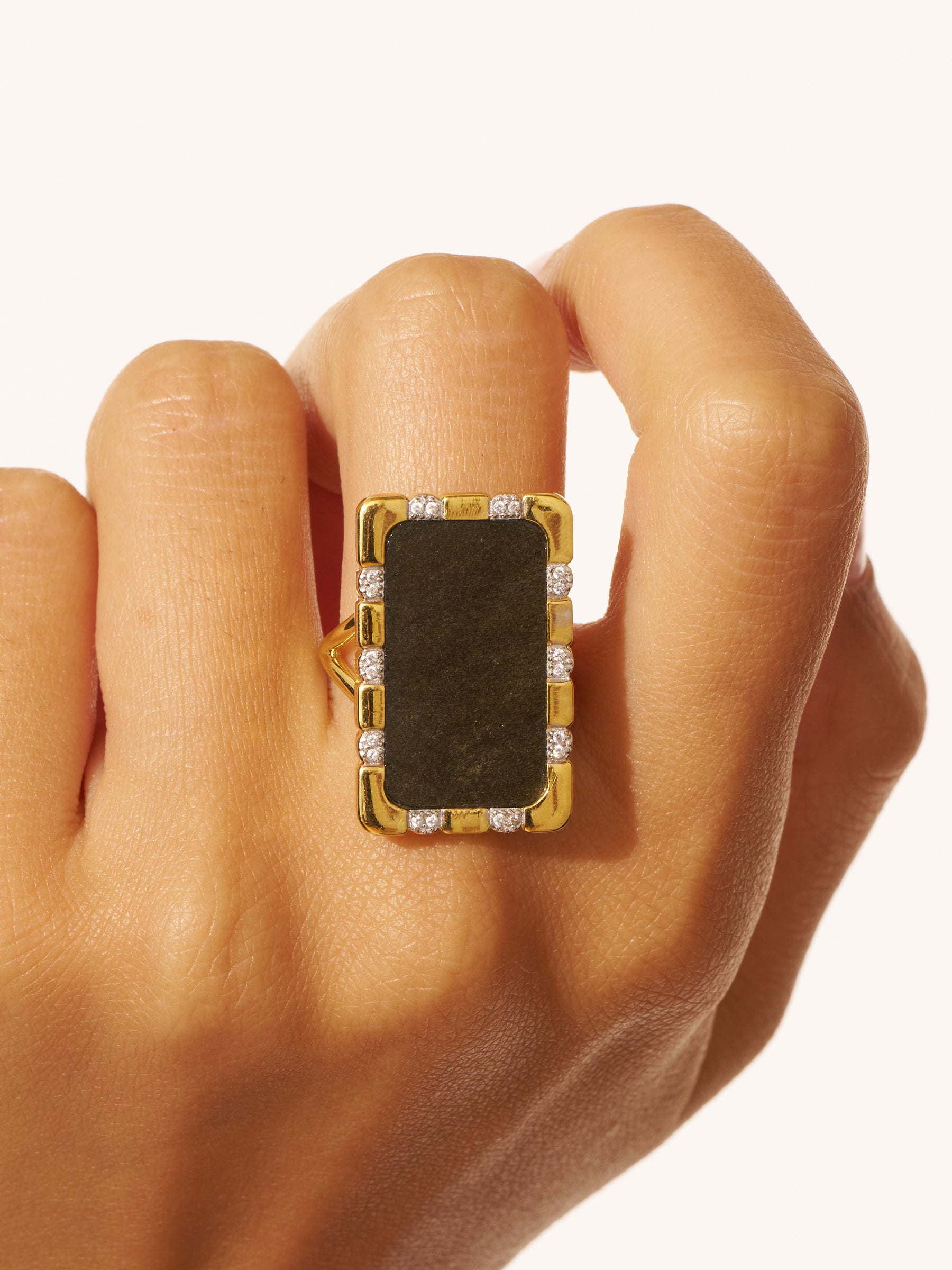 The Bianca Golden Obsidienne ring, whose name evokes purity and elegance, is a true work of craftsmanship. Its imposing and graphic design, marked by a bold rectangular silhouette, demonstrates meticulous know-how. Worn alone, this XXL ring enhances minimalist outfits with character.