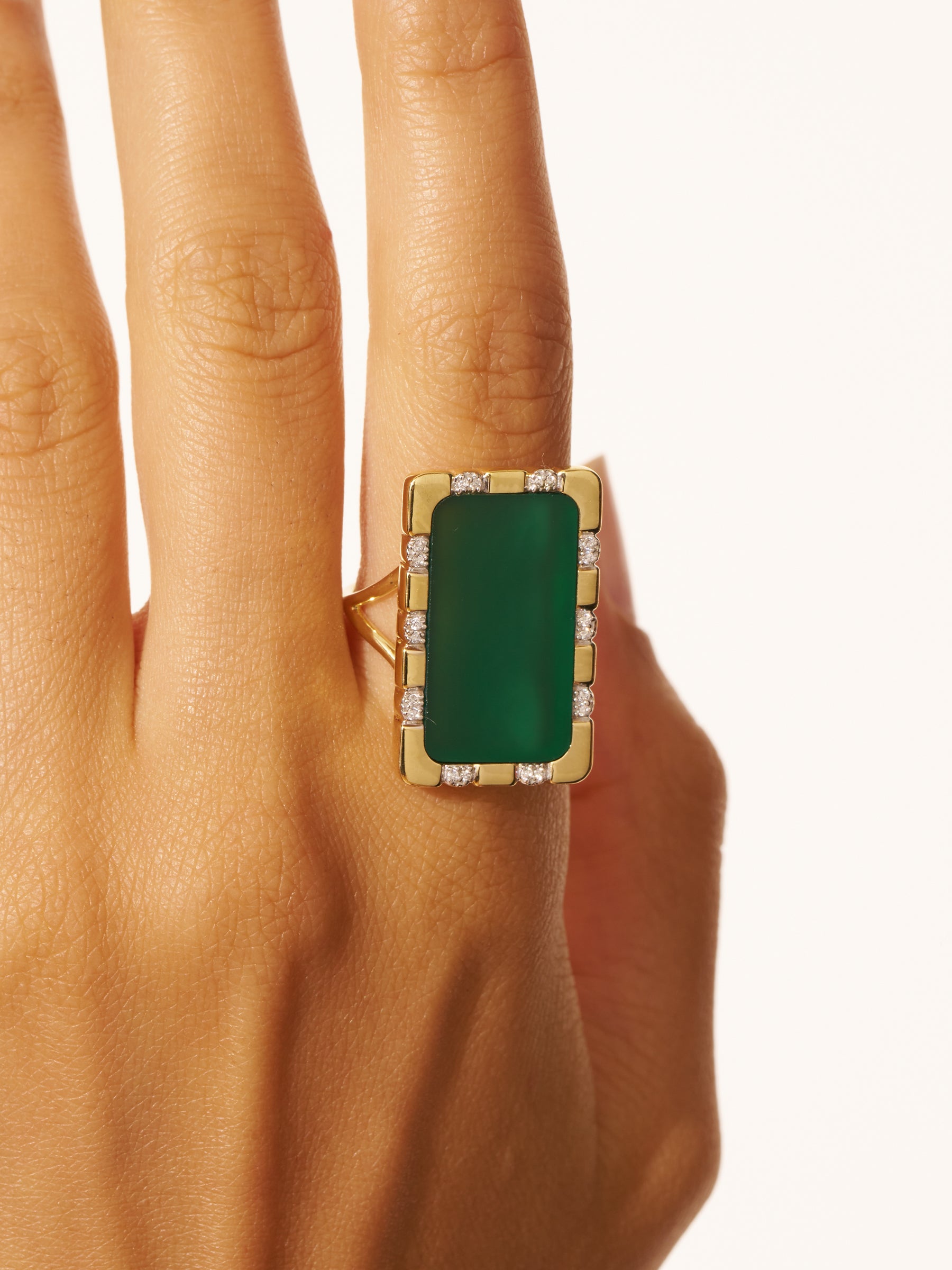The Bianca Green Onyx ring, whose name evokes purity and elegance, is a true work of craftsmanship. Its imposing and graphic design, marked by a bold rectangular silhouette, demonstrates meticulous know-how. Worn alone, this XXL ring enhances minimalist outfits with character.