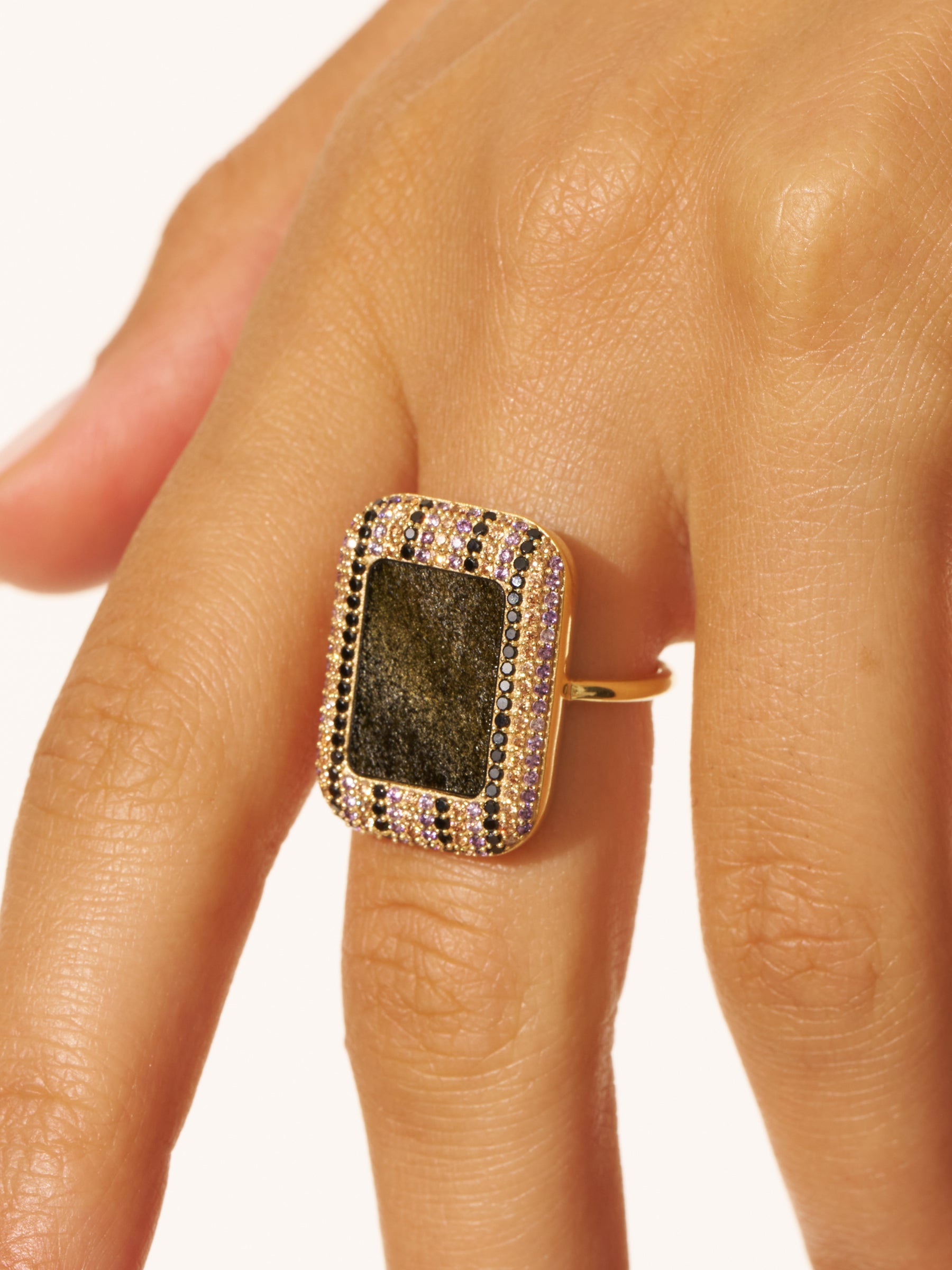 Vibrant with know-how, gold and silver, the Karma ring attracts attention. All in light and roundness, it combines a pop aesthetic with vintage influences. Its domed shape, decorated with fine zircons arranged in vertical lines, alternating three rows of vibrant colors, creates a captivating graphic effect.