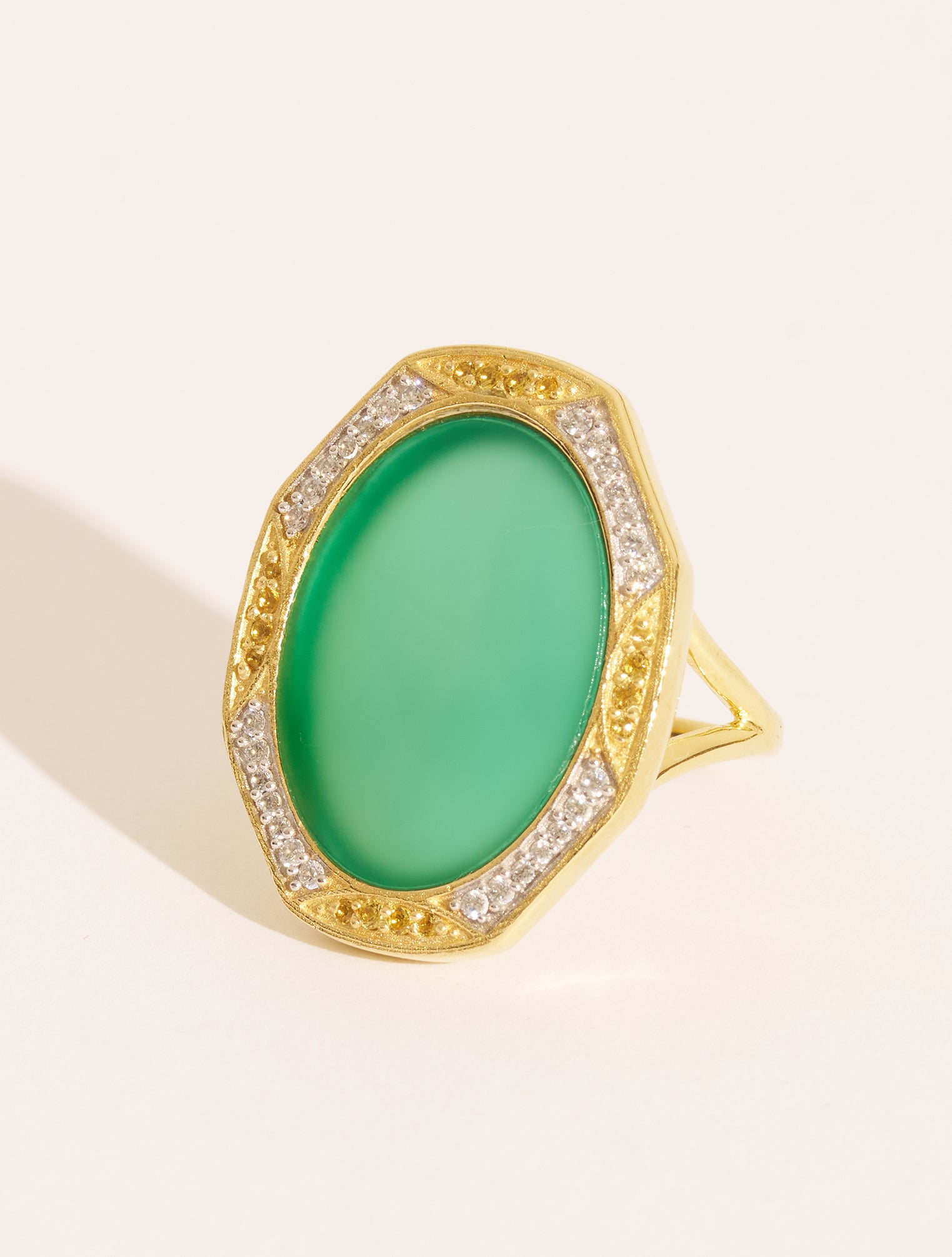 Rich in history and craftsmanship, the Sinaï ring is a luminous and generous masterpiece where gold blends seamlessly with silver. Its oval shape is adorned with a radiant, large stone, surrounded by alternating gold and silver zircons that create an elegant frame. These subtle details are brought to life through our artisanal expertise, making this ring a truly precious ornament.