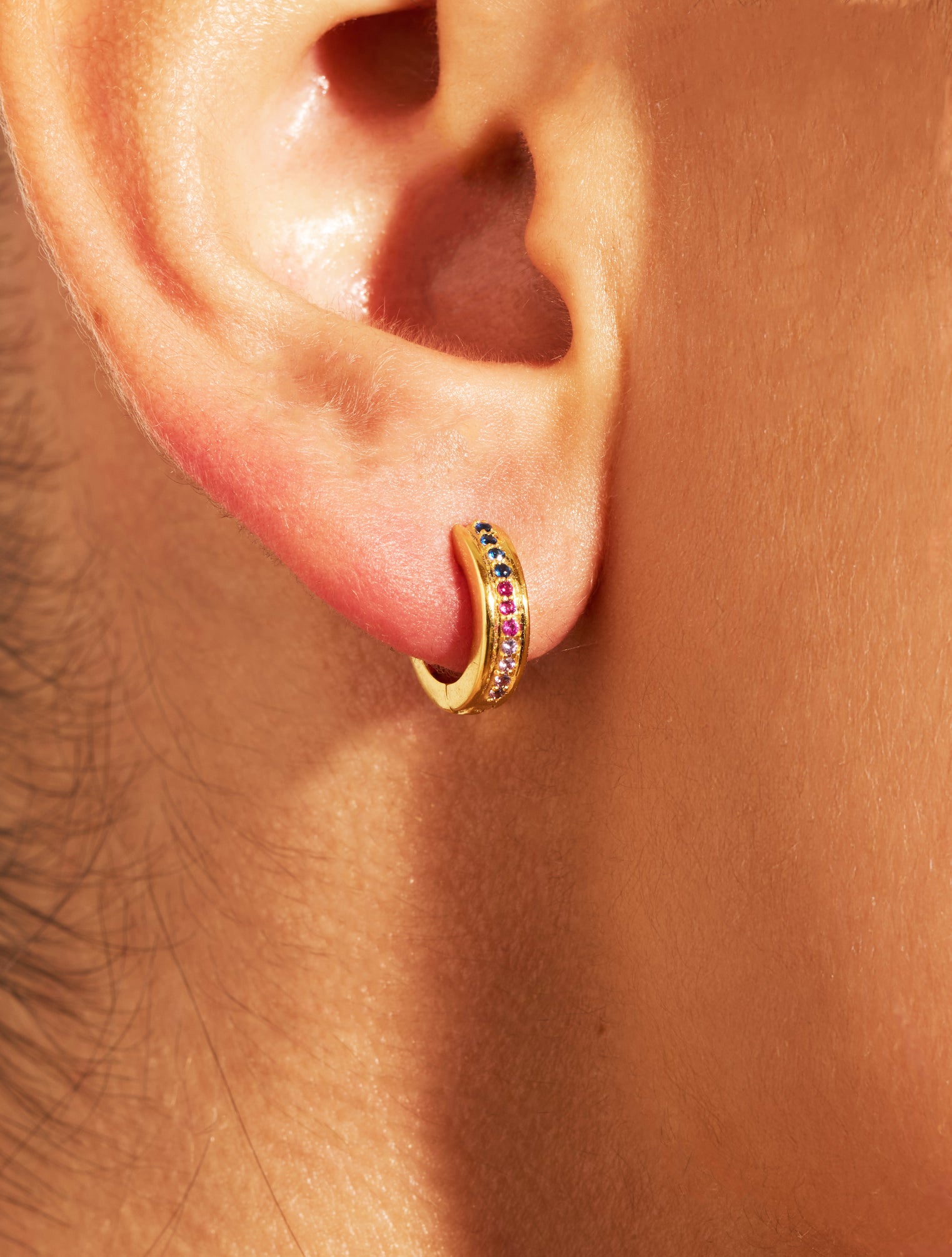 With their minimalist design, the Rive d'Or thick mini hoops in blue, fuchsia, and purple reinterpret timelessness with brilliance. Between their gold plating and the curved line of fine set zircons, this pair captures the light with precision. With their delicately bold volume, these hoops can be worn both alone or paired with other creations from the same collection.