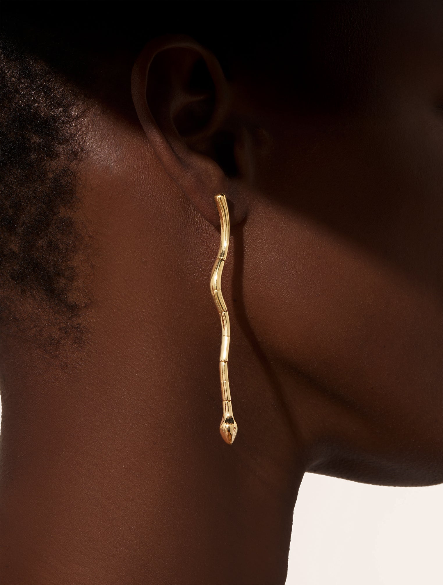 Elongated and luminous, the Serpent Earrings in gold-plated brass extend the silhouette with reptilian grace. As their textured curves ripple, the golden finish enhances the fluidity of movement ; both supple and assured. Balancing brilliance and fluidity, these dangling earrings move effortlessly with every gesture and complement any look without ever feeling static.