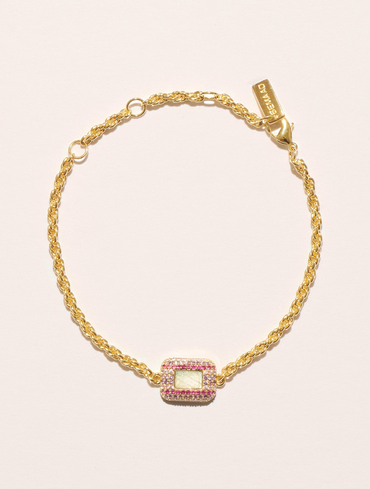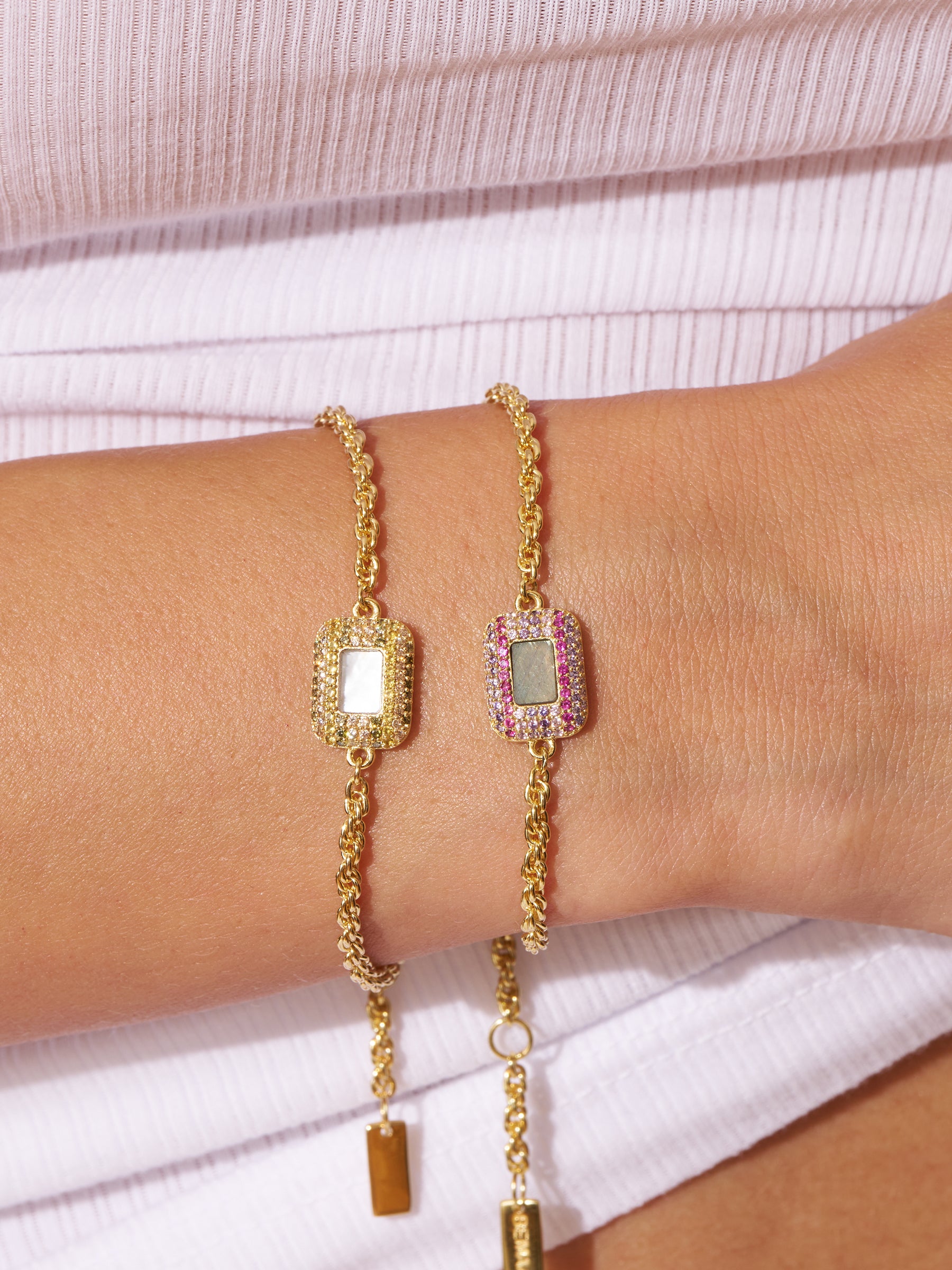 A delicate golden chain, a vibrant suspended stone, a myriad of gold and silver zircons: the Karma bracelet sparkles with a thousand reflections. Enhancing all wrists thanks to his meticulous know-how, he enjoys playing with textures and colors. At the center of its golden chain made of fine golden links, a rectangular stone with rounded corners dances with the light. Around it, the zircons, arranged in three vertical rows in vibrant tones, create a striking graphic effect, amplifying the brilliance and relief of this piece.