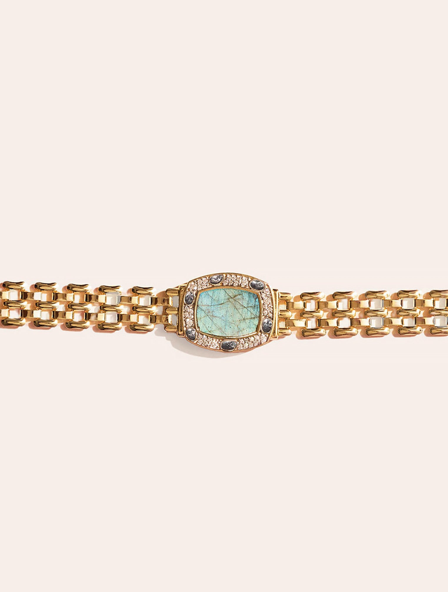 A bit wild, the Ranee labradorite bracelet interweaves the history of the past with that of the present. Mirroring the codes of the vintage watch, it borrows its flexibility and class, while inviting a fragment of modernity.