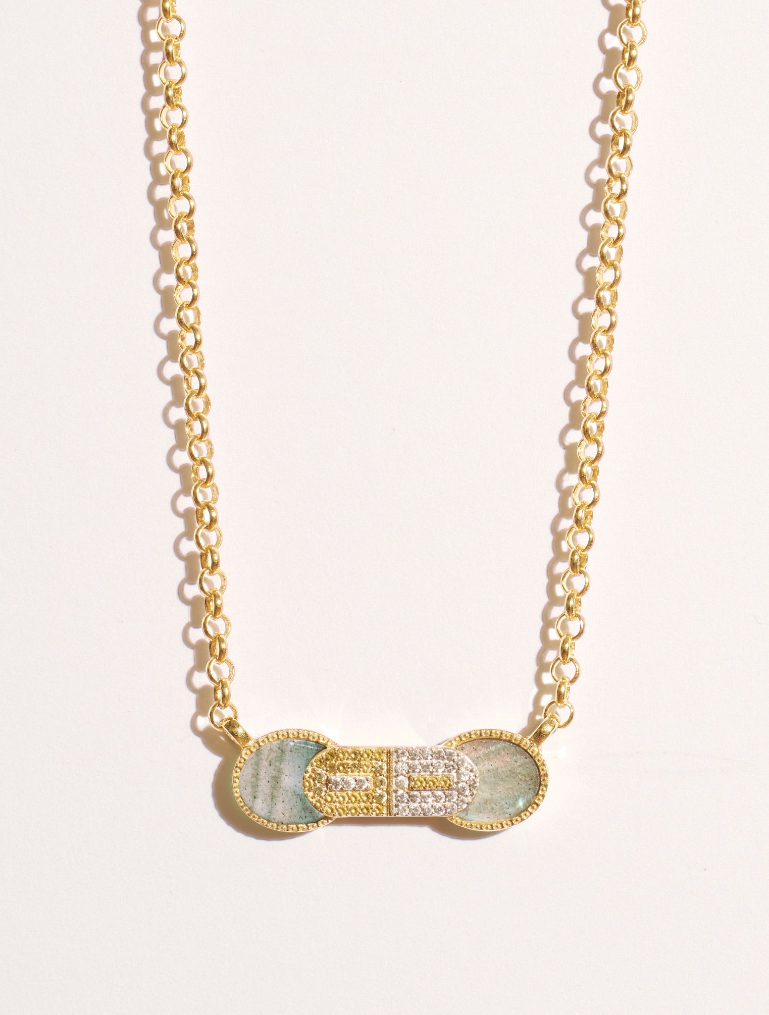 Fusing geometry, gold, and silver, the Sinae necklace harmoniously blends traditional shapes with modernity. The delicate layering of gold and silver zircons, crafted with exceptional artisanal expertise, creates a captivating play of hypnotic reflections, capturing light with every movement. Each side is adorned with a deeply hued oval-cut stone, set within a textured golden border.