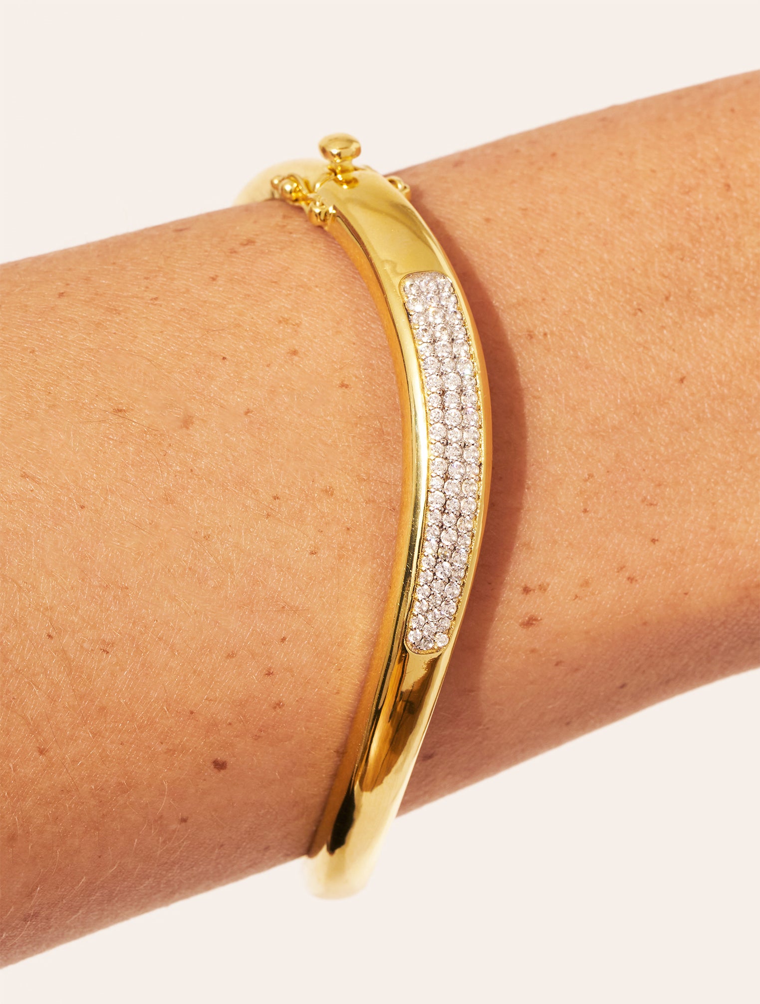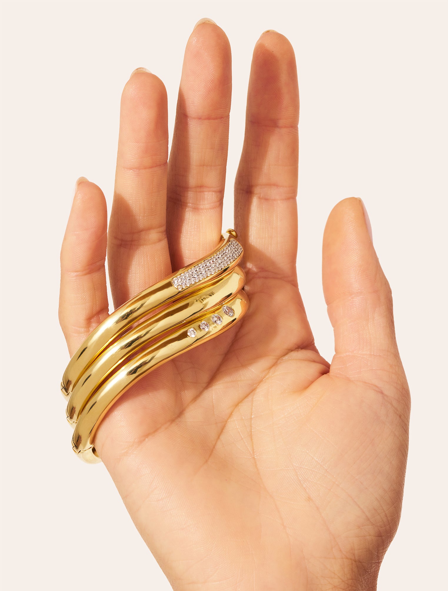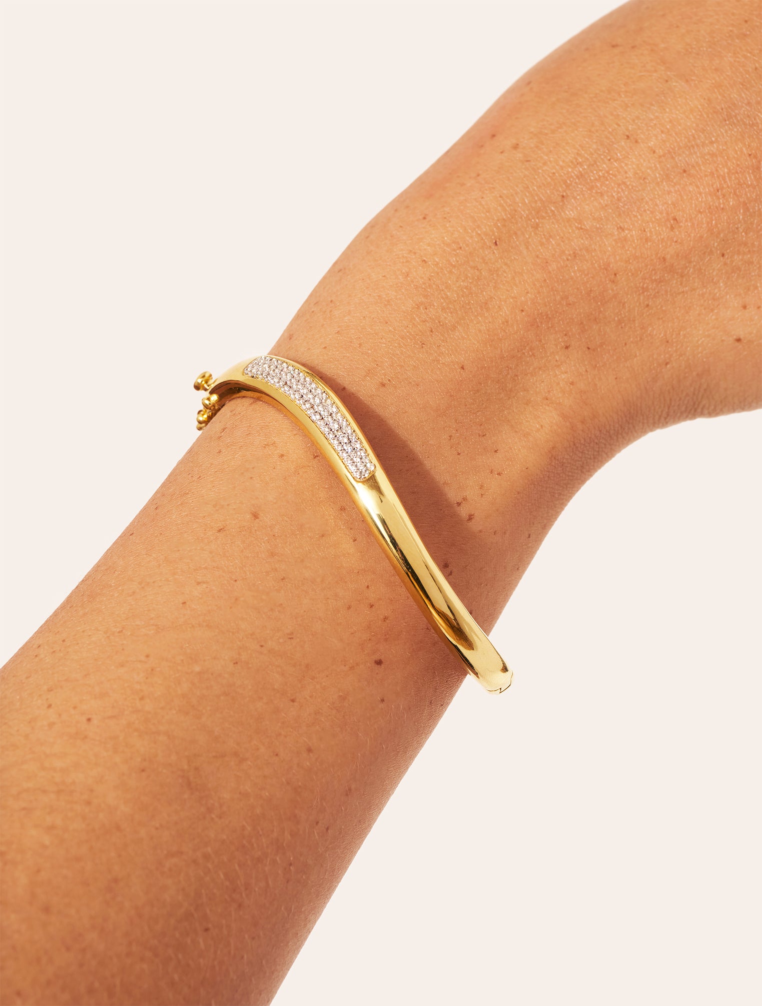 Carried by a wave of light, the curved, zircon-paved bangle instantly brings movement. Entirely set on the front, this piece plays the card of statement jewelry. It combines texture, shine, and fluidity in a single, continuous line. Perfect for wrists that like to stand out with style and distinction.