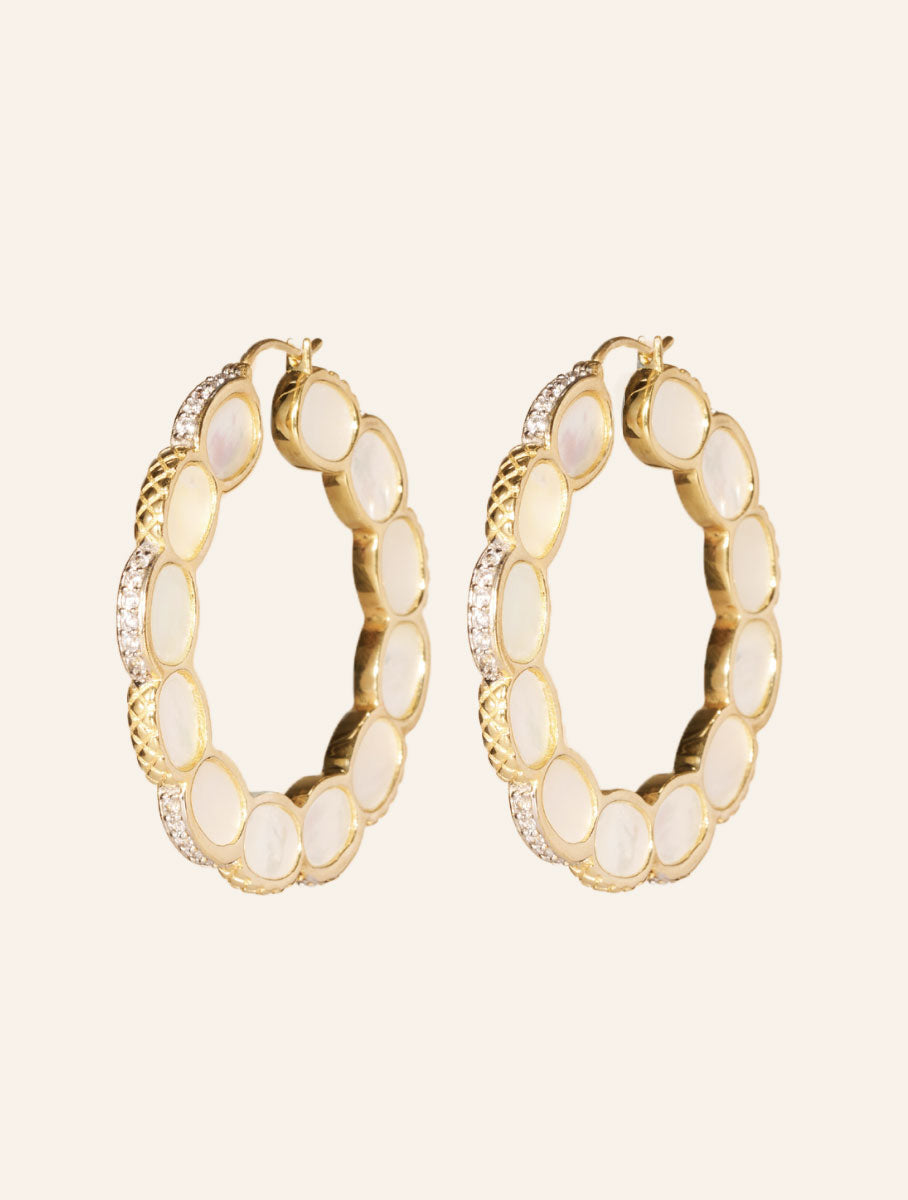 Sublime creation, subtle manufacturing : the pair of Amara Nacre earrings leaves you speechless. If the meticulous hide and seek of gold and silver zircons on the sides is fabulous, the presence of fine stones encrusted in each oval shape, reminiscent of beautiful petals, is very elegant. Without a doubt, the timeless and original look of these hoop earrings makes them a marvel.