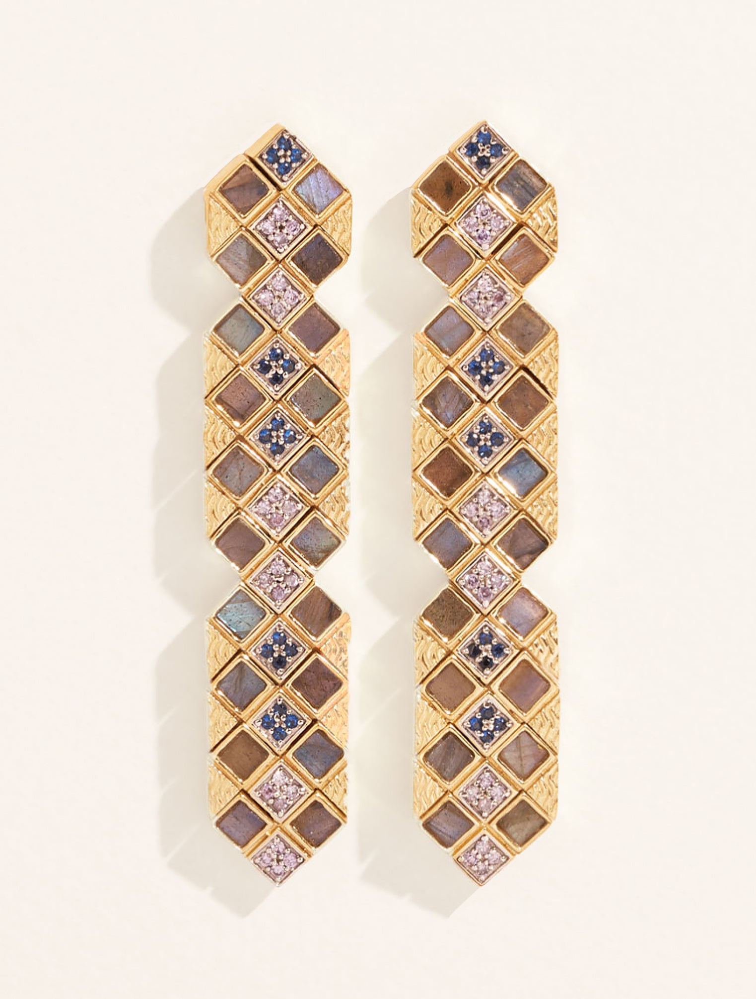 Inspired by the art deco style, the Idylle labradorite earrings are as easy to look at as they are to wear. Parallel to your face, its soft and graphic curves will enhance any look. Its golden and colorful combination of diamonds, natural stones and fine zircons is a reflection of the know-how of our craftsmen: exceptional.