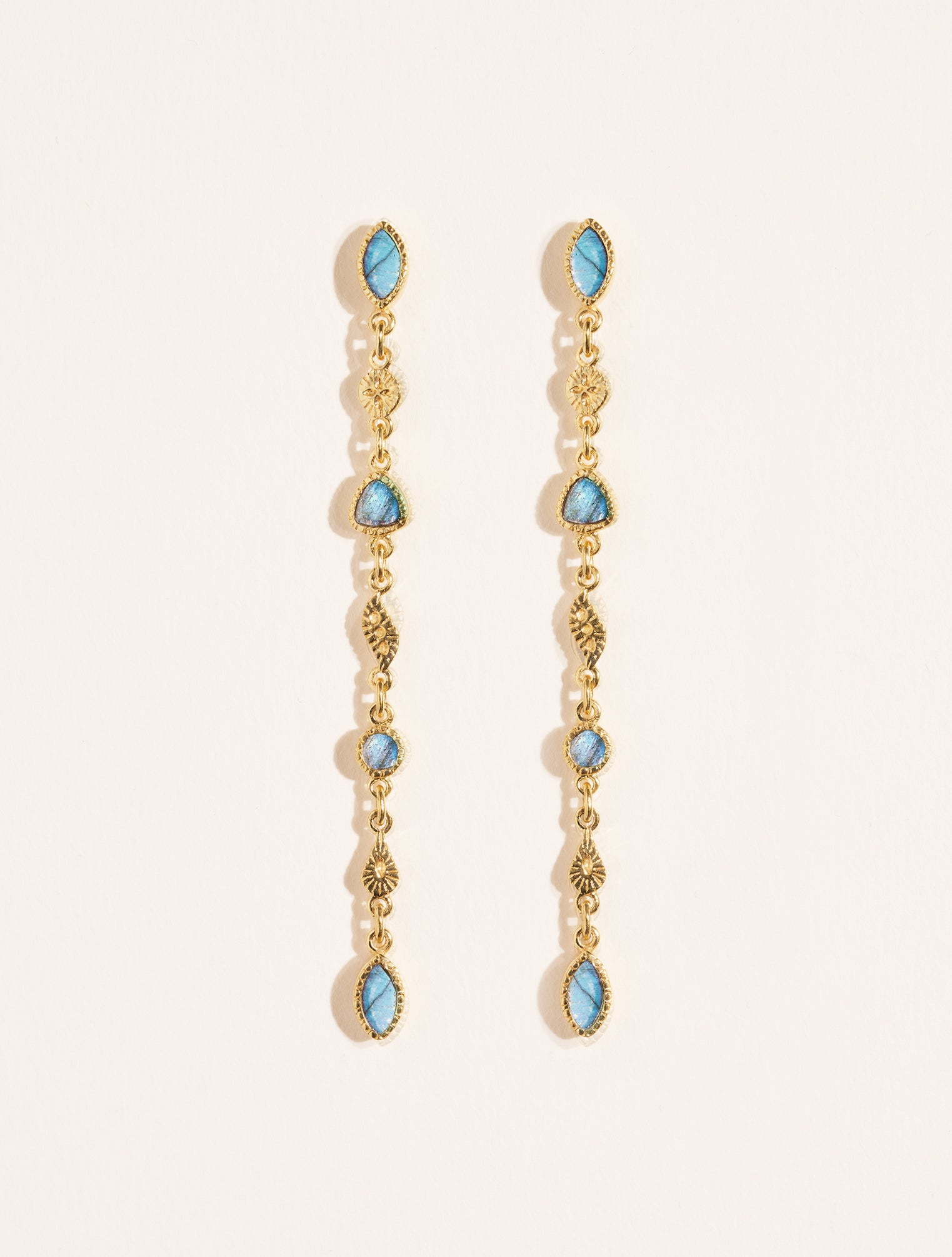 Dazzling and luminous with its hand-applied gold leaves, the Macha collection will brighten up your outfits with character. This pair of earrings is perfect for brightening up your daily outfits. They beautifully combine stones and tassels.