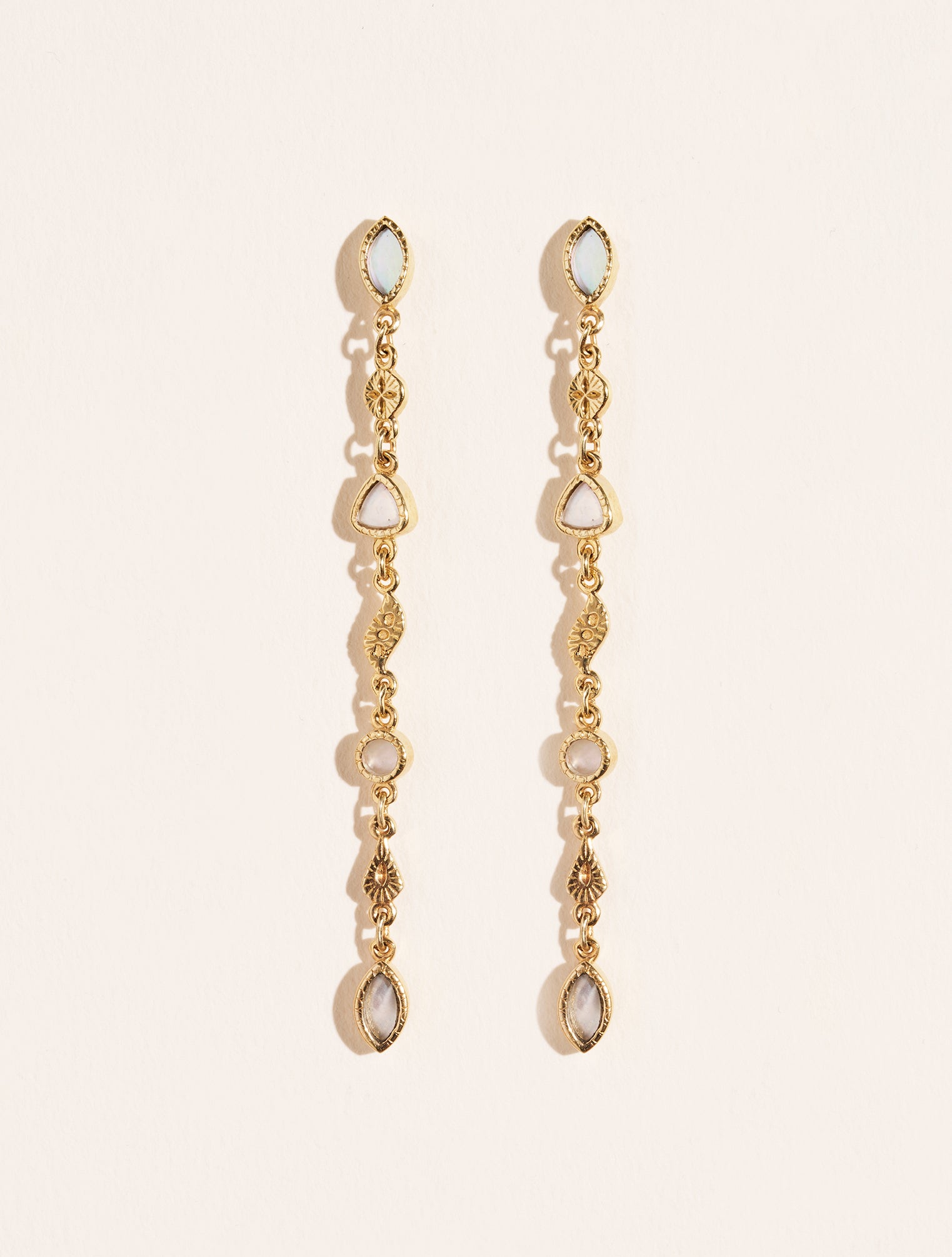 Dazzling and luminous with its hand-applied gold leaves, the Macha collection will brighten up your outfits with character. This pair of earrings is perfect for brightening up your daily outfits. They beautifully combine stones and tassels.