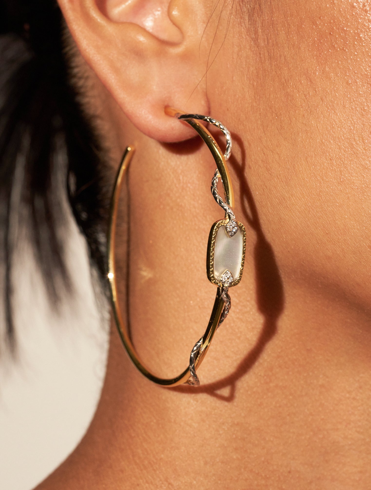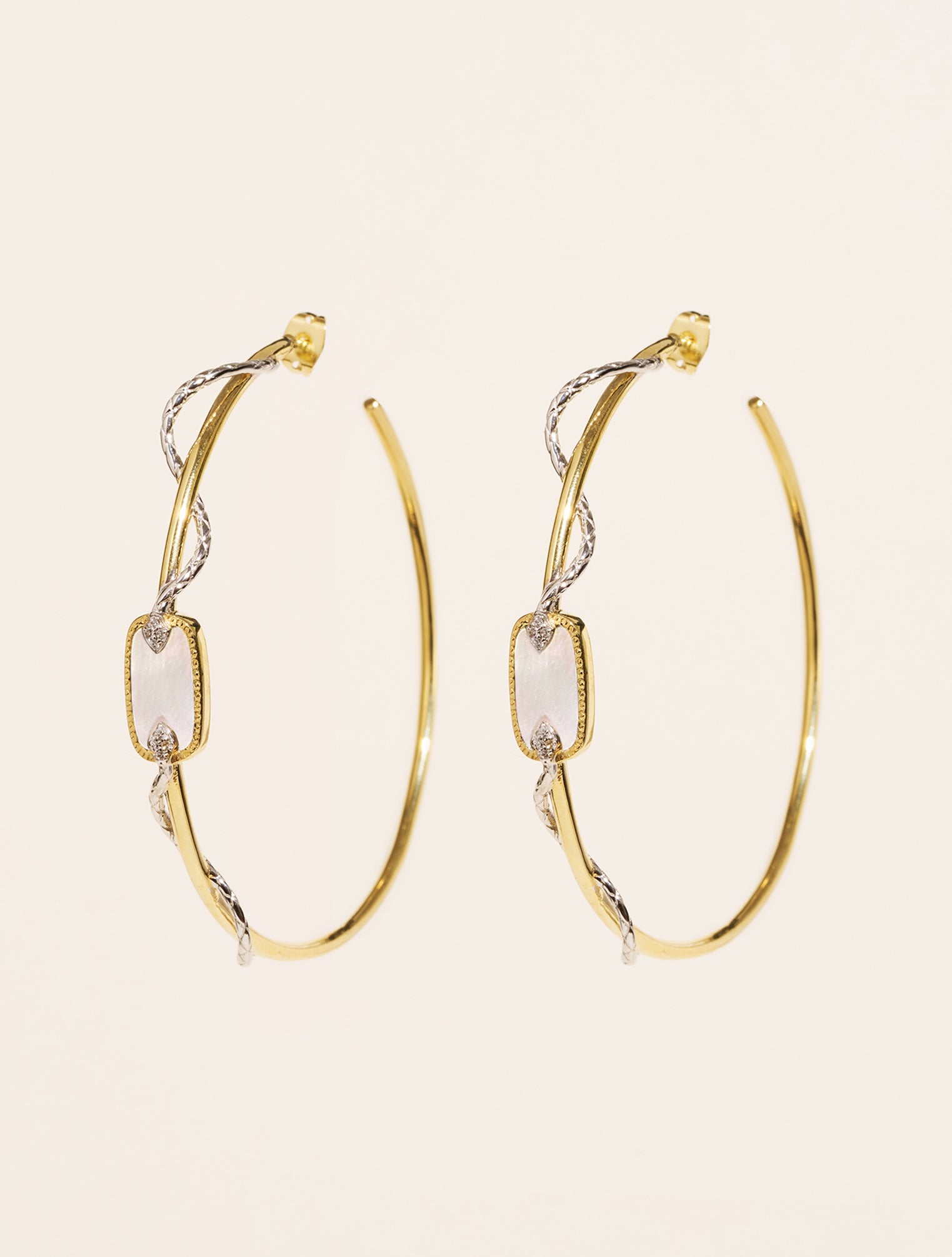 Creoles yes, but not just any hoops. At Be Maad, we like uniqueness, not banality. So we imagined the Sangha Mother-of-Pearl earrings as a graphic and modern piece on which a fine stone is nestled, hand-worked by our artisans.