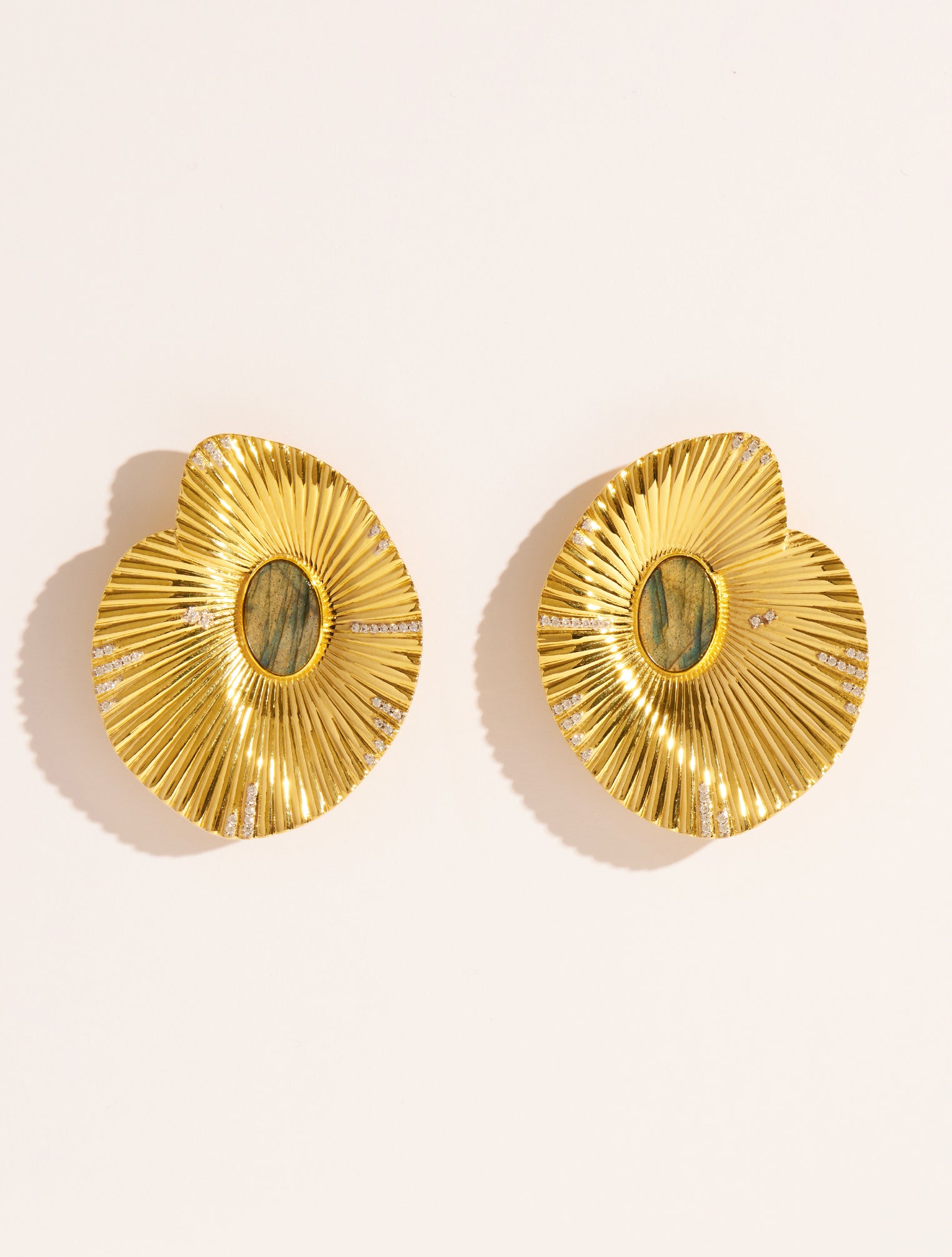Majestic and radiant, the Soleil Sauvage Labradorite shell earrings stand out with their volume and luminous details. Boldly sculptural, they reinterpret the ocean with vibrant textures and a flat oval central stone, highlighted by a constellation of zircons.