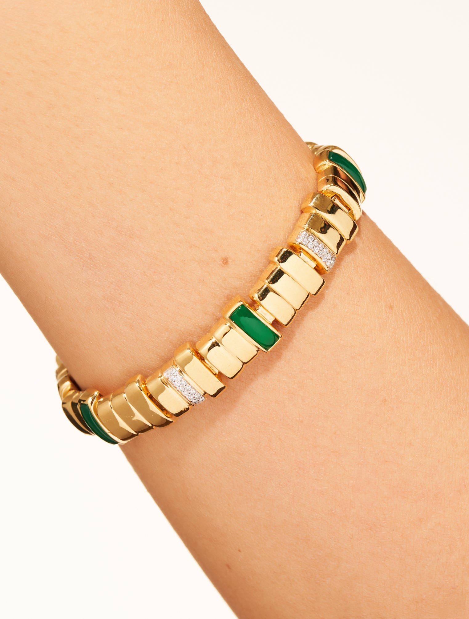 Like a precious tattoo, the Empreinte Green Onyx articulated bracelet leaves its mark on the skin with intensity. Its structured yet fluid design combines the strength of carefully set rectangular stones with the subtle sparkle of the accompanying white zircons. Each flexible link adapts to the movements of the wrist, offering an intimate, unique connection between the jewelry and you.