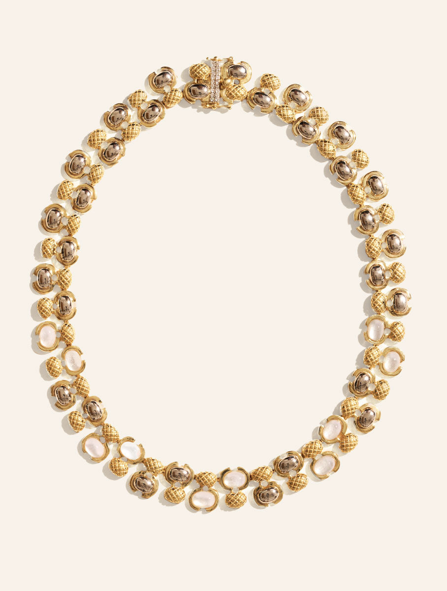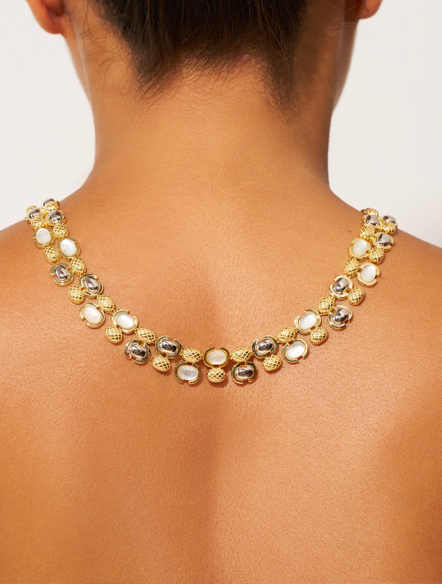 At the zenith of originality : the Amara Mother of Pearl necklace, the one that brings a host of minute details to your neck ! In a row, the small rounded balls tattooed with a handmade pattern stand alongside pretty, mini-stones. As complementary as they are graphic, they both combine a joyful mix of gold and silver. Also highly appreciated for its innate agility, the Amara necklace is undeniably chic and charismatic !