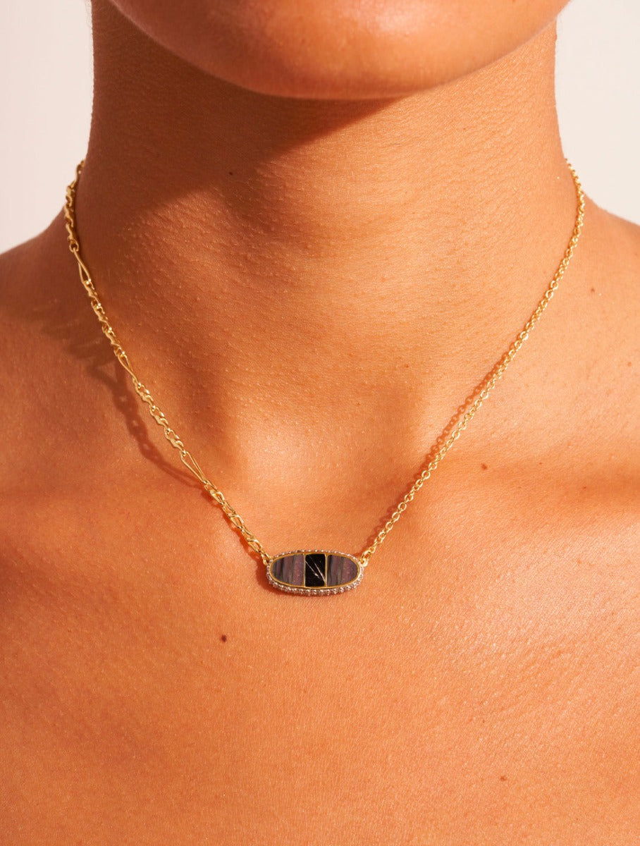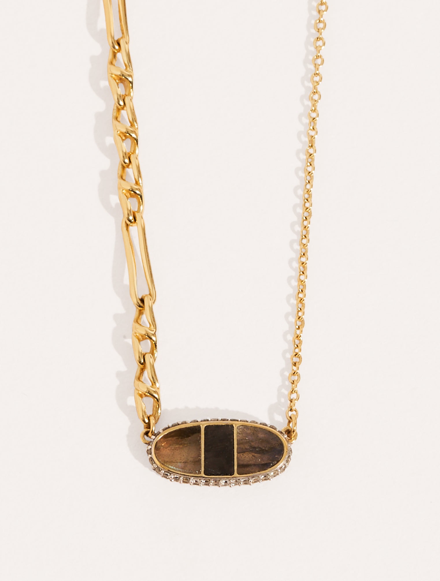 An extraordinary piece of jewelry with pop inspirations, this Izy Textured Onyx and Labradorite necklace has as much charm as it has character. By playing on the finesse of its golden chain and the light of its stone, it seduces at first glance. Once worn around your neck, this creation will let its hand-cut zircons sparkle and enhance your neckline to perfection.