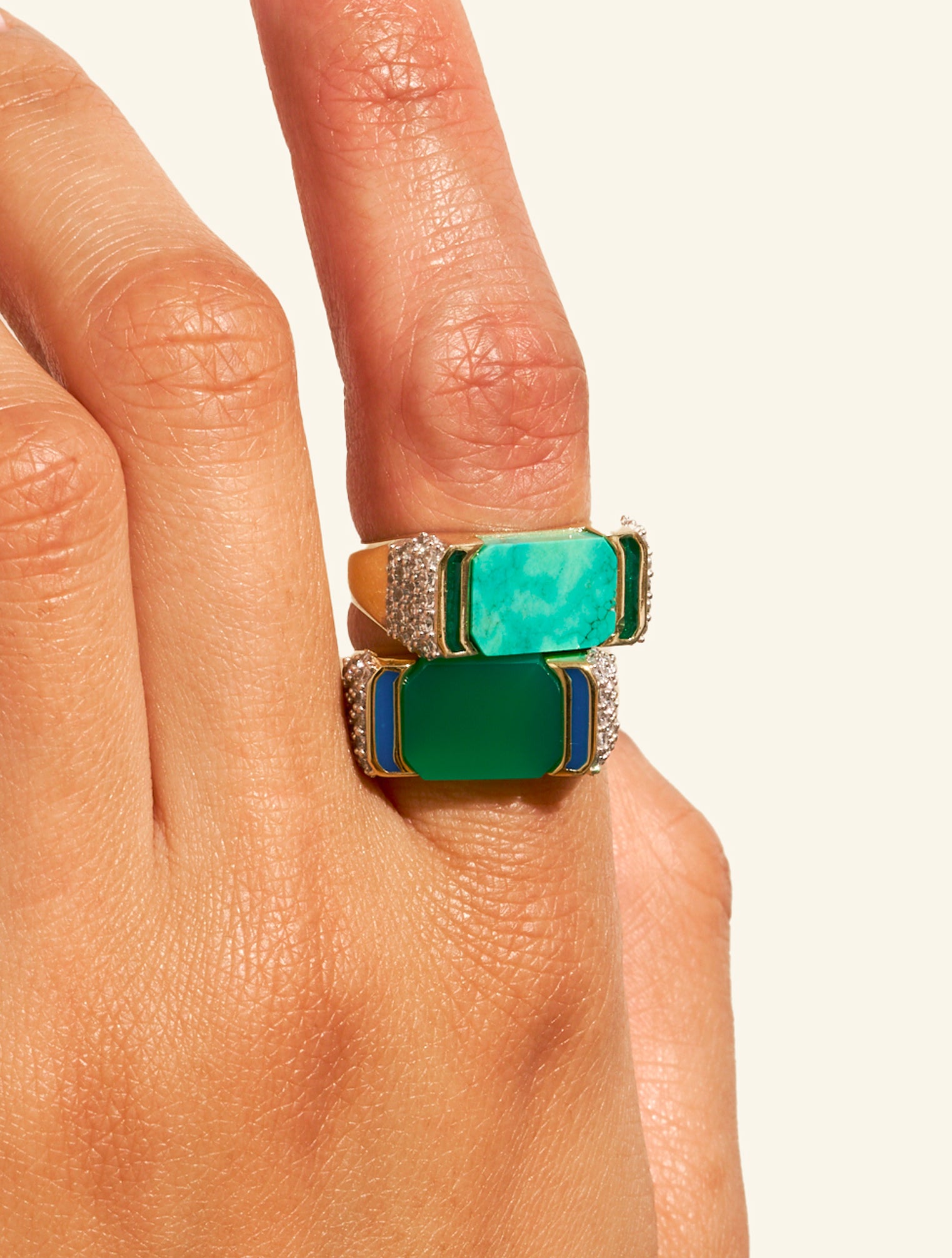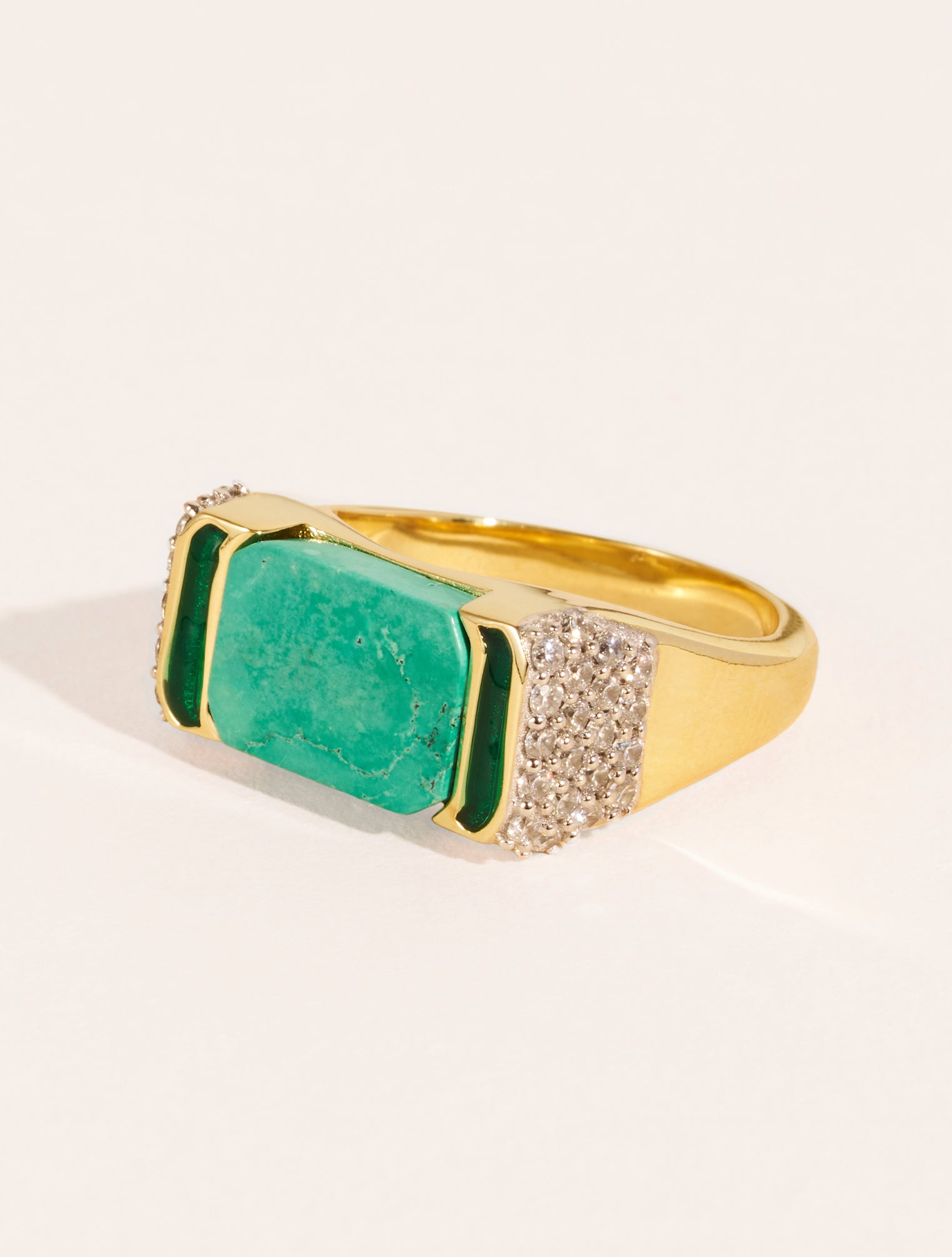 Tinted with timelessness, the Berry Turquoise ring wonderfully brings together stones, zircons and enamel. Beneath its classic appearance, it has a nice touch of modernity thanks to its contrast of colors and textures. Its trio of materials gives it structure and vintage charm, which you will love to place on one of your fingers.