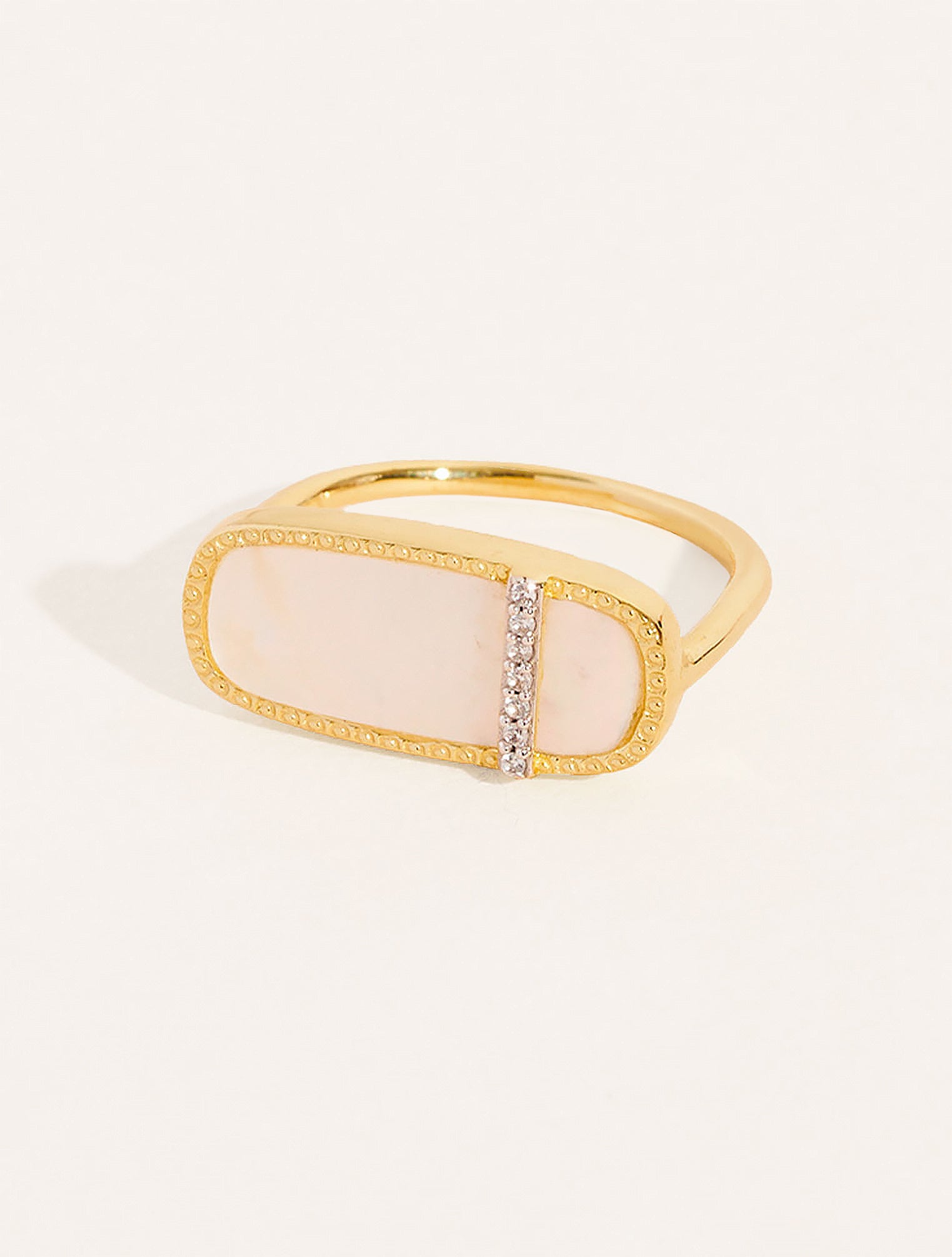 Resolutely pop, the Izy ring in rectangular Mother-Of-Pearl crossed with a thread of sparkling zircons captivates with its aura filled with light and originality. Also majestic worn alone or accompanied by other creations, it's up to you to choose your favorite combination.