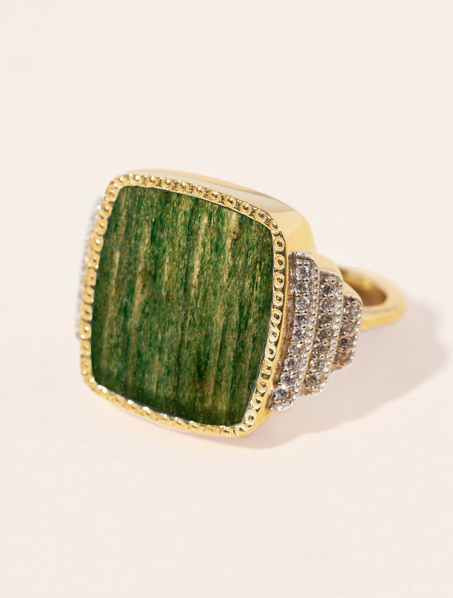 All in brilliance and magnificence, the Kara Aventurine ring revisits the precious inherited family ring. Adorned with a fine graphic stone and sparkling white zircons, its vintage and modern look is to die for.