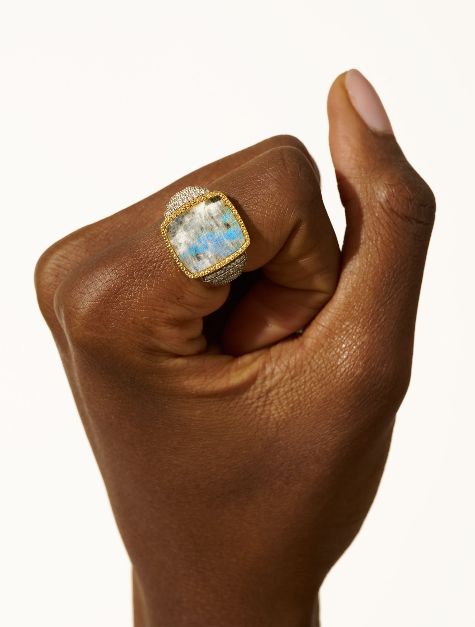 All in brilliance and magnificence, the Kara Onyx and Moonstone ring revisits the precious inherited family ring. Adorned with a fine graphic stone and sparkling white zircons, its vintage and modern look is to die for.