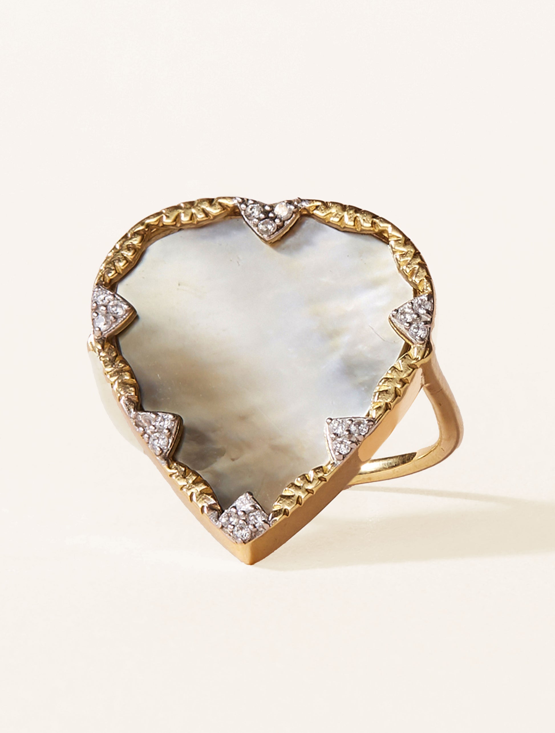 The Lima Grey Mother of Pearl ring subtly revises the shape of the heart, adorned with singular fine stones and boldly combines gold and silver. It will enhance your everyday outfits.
