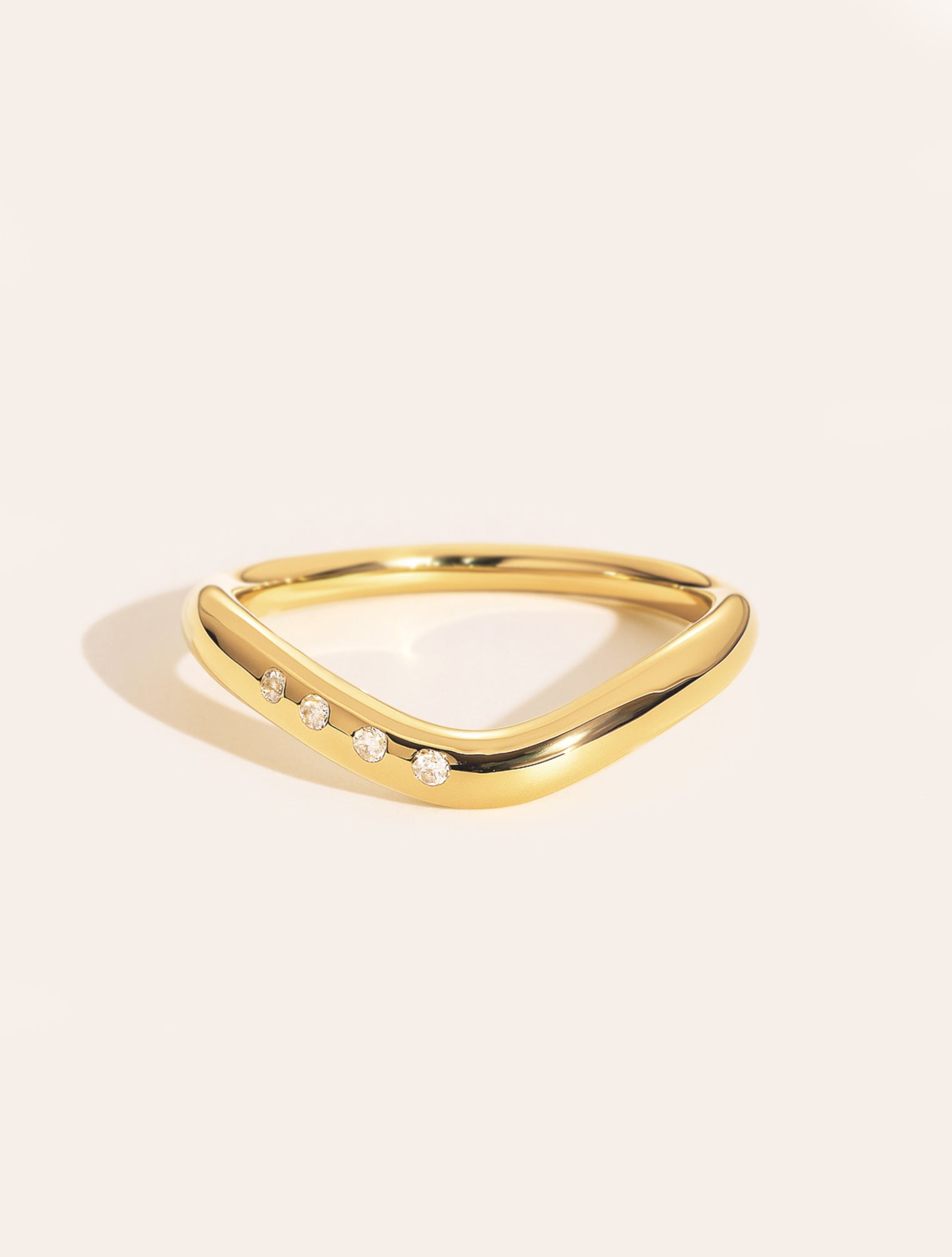 Fine yet unique, this curved ring with set zircons draws a pretty, flowing line on the skin. Its four points of light distributed across the front magnify its solar gilding and glorify its craftsmanship. Easy to wear every day, easy to mix and match endlessly.