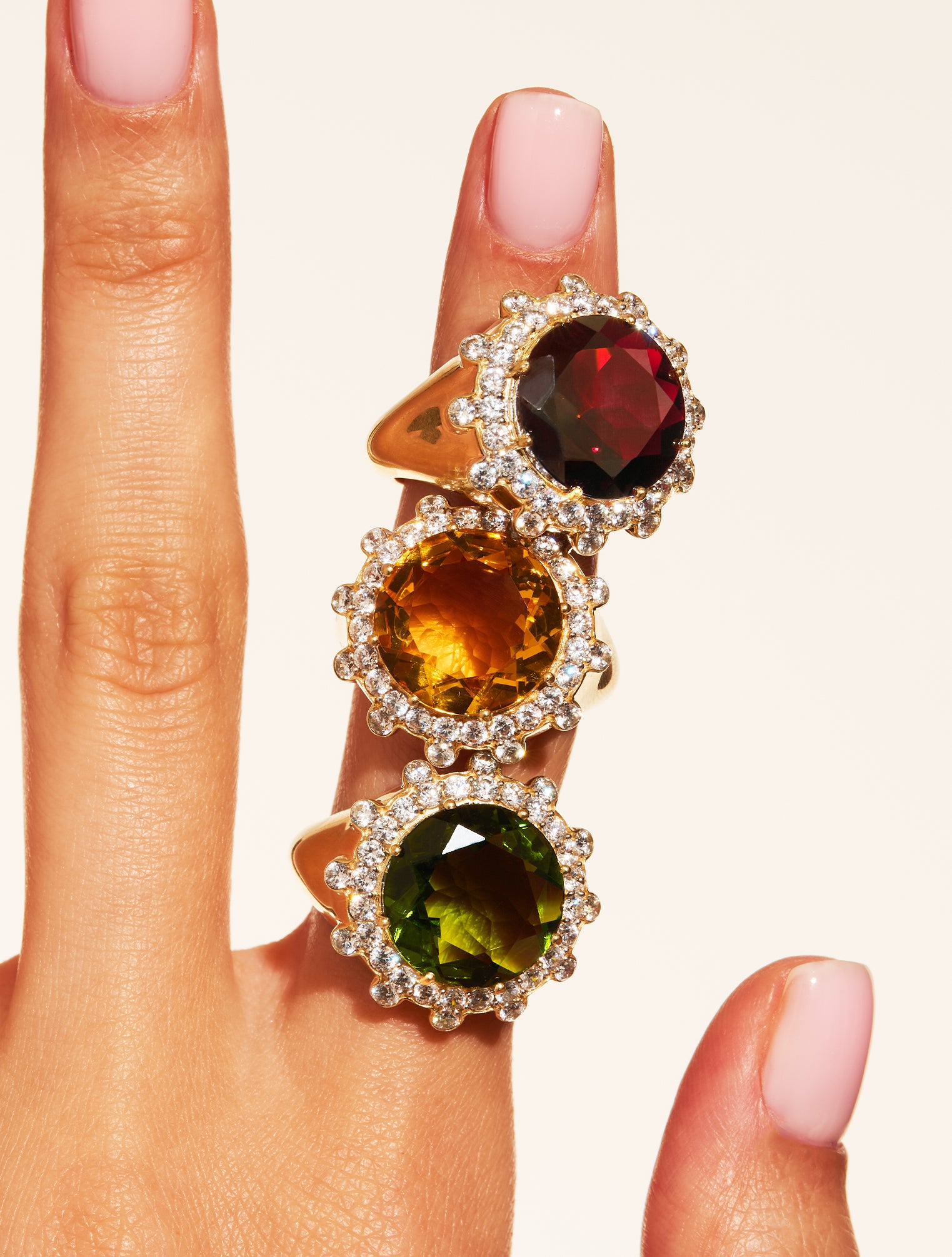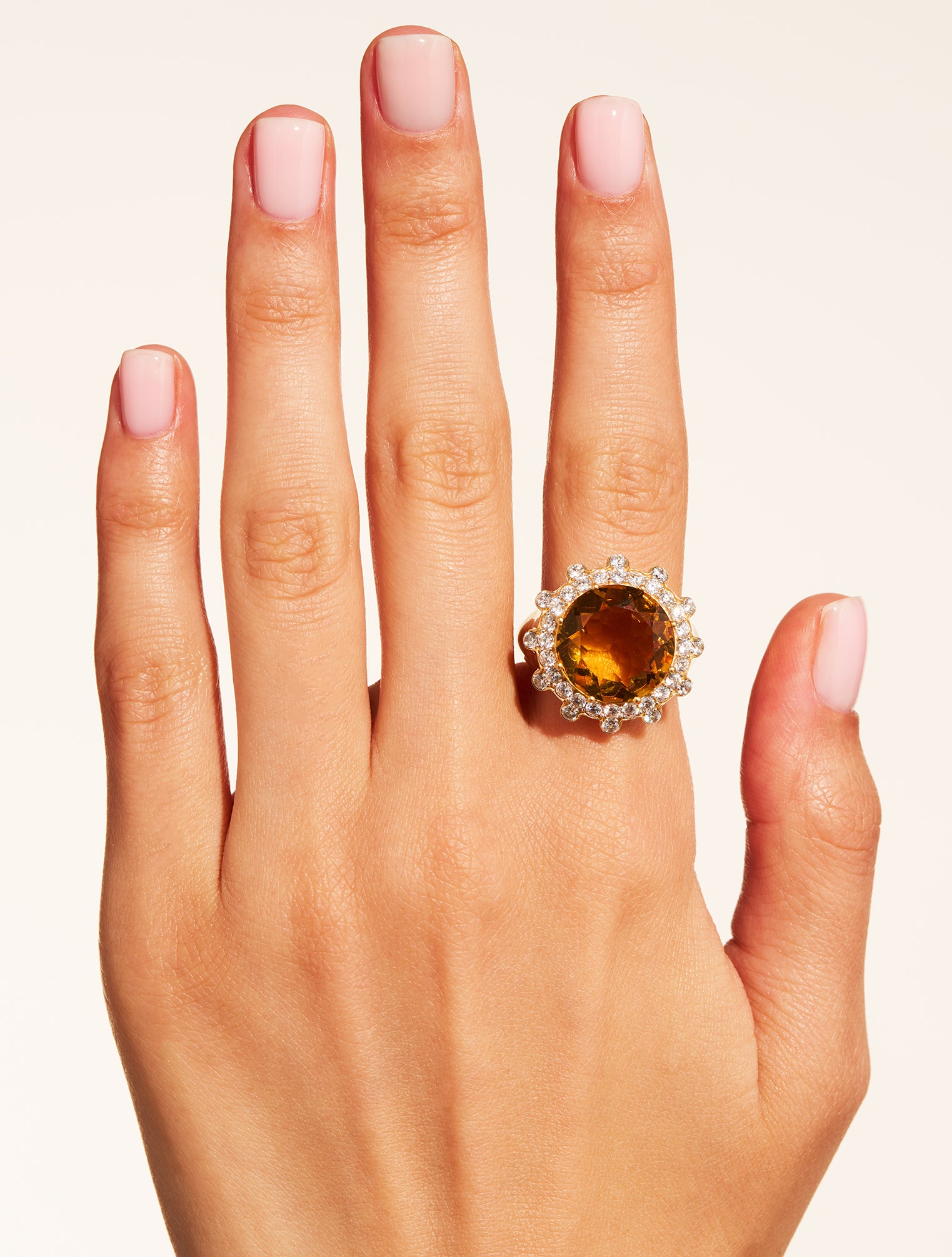 Sculptural and bold, the Soleil Sauvage solar ring in Yellow shines with a bold radiance. Its large central zircon captures every reflection, while the smaller ones surrounding it intensify its chic, artisanal character. Crafted like a material in motion, its textured ring plays with light and asserts a strong presence, somewhere between opulence and modernity.