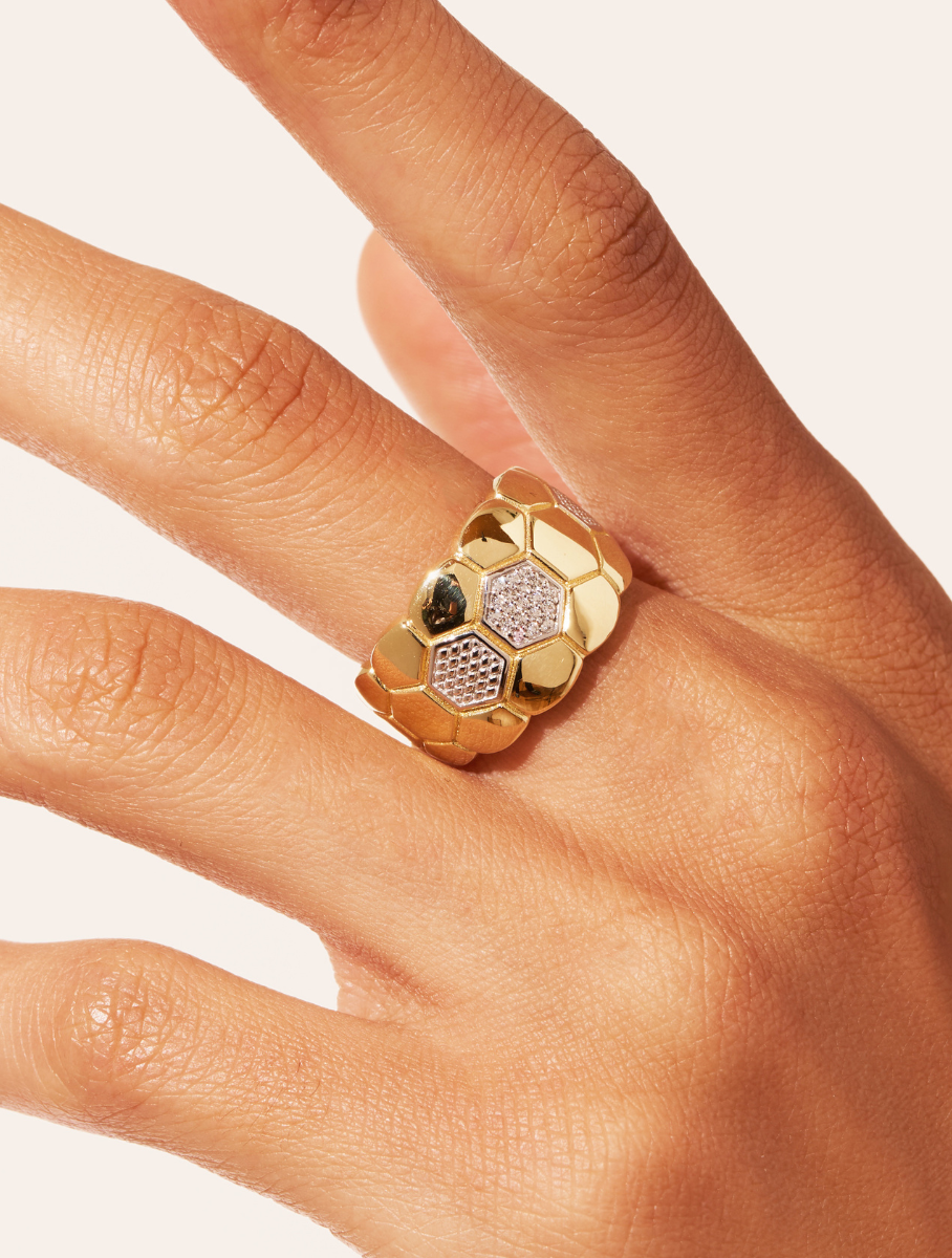 À l’image de cette créature fascinante, la collection Abeille est née pour être spéciale et captivante. Reflets de la perfection naturelle des formes géométriques de la ruche, ces deux bagues revisitent son motif unique.