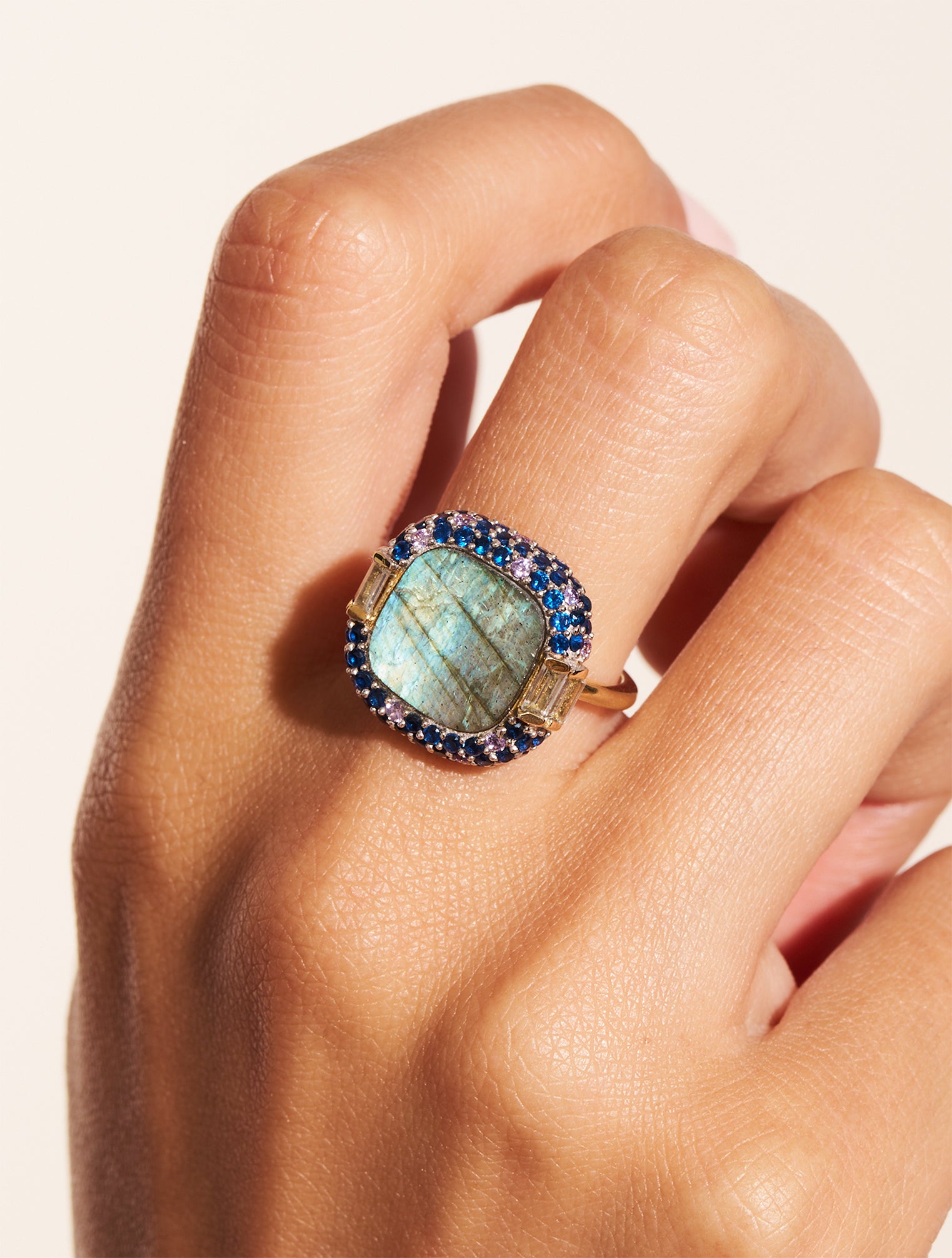 Couronnée d’une kyrielle de petits zircons, la bague Idylle en labradorite est un réel joyau au style rétro bien affirmé. Sur fond d’un coloris dominant, une seconde teinte vient rejoindre ce damier scintillant, tout en modernité. La luminosité de sa pierre centrale combinée à celles des deux autres sur chaque côté sont éblouissantes. Tout en reflets et en savoir-faire, cette création façon petit coussin épousera votre doigt royalement.