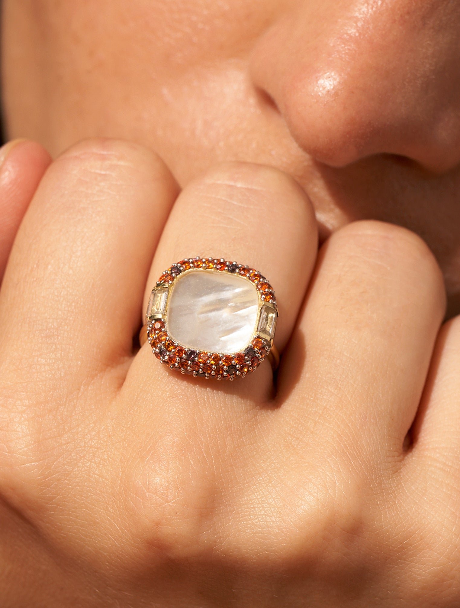 Couronnée d’une kyrielle de petits zircons, la bague Idylle en nacre est un réel joyau au style rétro bien affirmé. Sur fond d’un coloris dominant, une seconde teinte vient rejoindre ce damier scintillant, tout en modernité. La luminosité de sa pierre centrale combinée à celles des deux autres sur chaque côté sont éblouissantes. Tout en reflets et en savoir-faire, cette création façon petit coussin épousera votre doigt royalement.