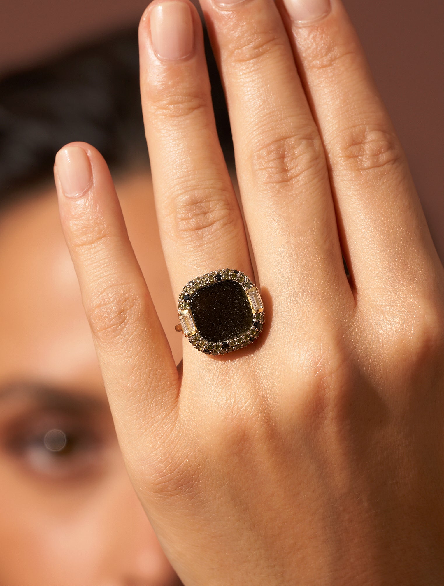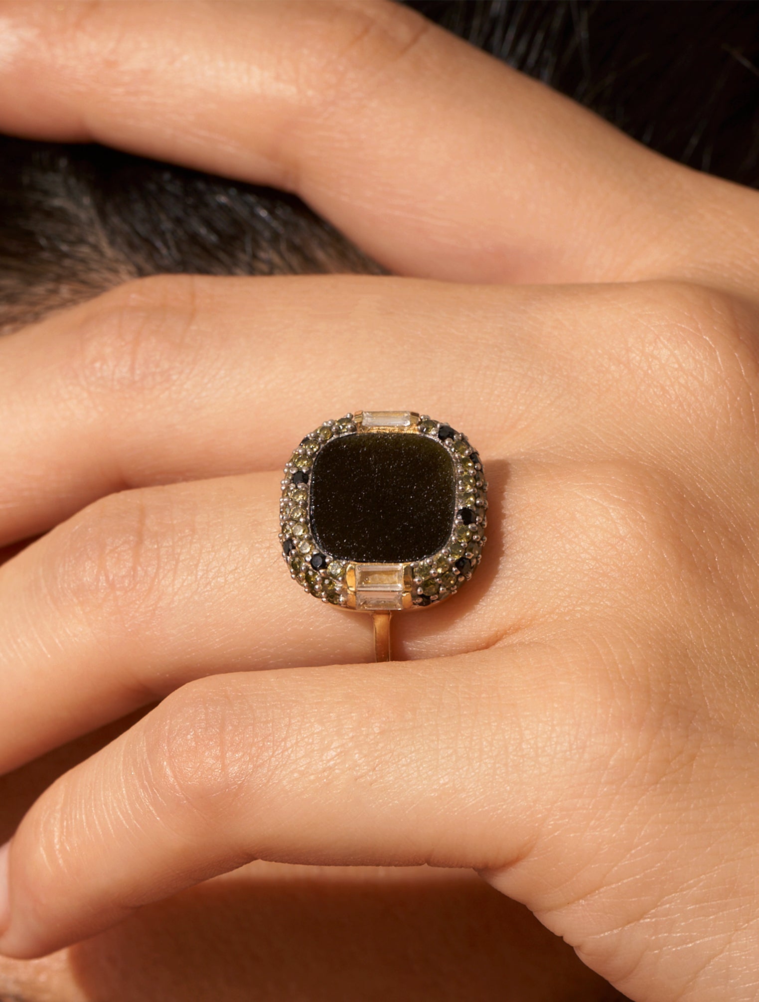Couronnée d’une kyrielle de petits zircons, la bague Idylle en Obsidienne dorée est un réel joyau au style rétro bien affirmé. Sur fond d’un coloris dominant, une seconde teinte vient rejoindre ce damier scintillant, tout en modernité. La luminosité de sa pierre centrale combinée à celles des deux autres sur chaque côté sont éblouissantes. Tout en reflets et en savoir-faire, cette création façon petit coussin épousera votre doigt royalement.