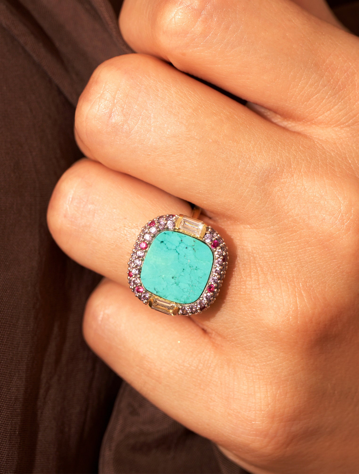Couronnée d’une kyrielle de petits zircons, la bague Idylle en Turquoise est un réel joyau au style rétro bien affirmé. Sur fond d’un coloris dominant, une seconde teinte vient rejoindre ce damier scintillant, tout en modernité. La luminosité de sa pierre centrale combinée à celles des deux autres sur chaque côté sont éblouissantes. Tout en reflets et en savoir-faire, cette création façon petit coussin épousera votre doigt royalement.