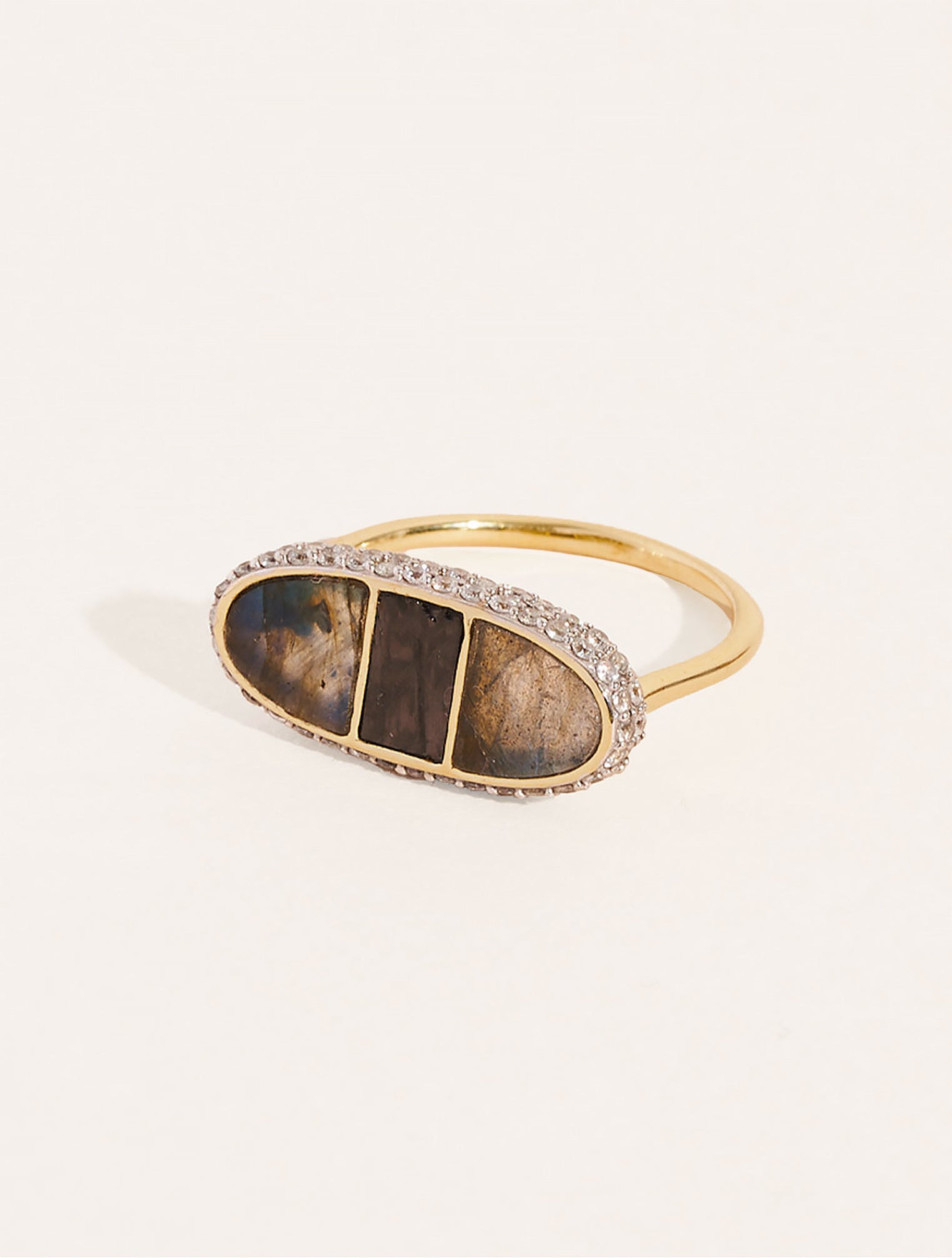C’est dans la simplicité de ses formes que rayonne la forte identité de la bague Izy en Labradorite et Onyx texturé. Tout en finesse et en subtilité, elle fascine autant par l’originalité de son mix de pierres que par la beauté de ses lignes, ornées de zircons étincelants.