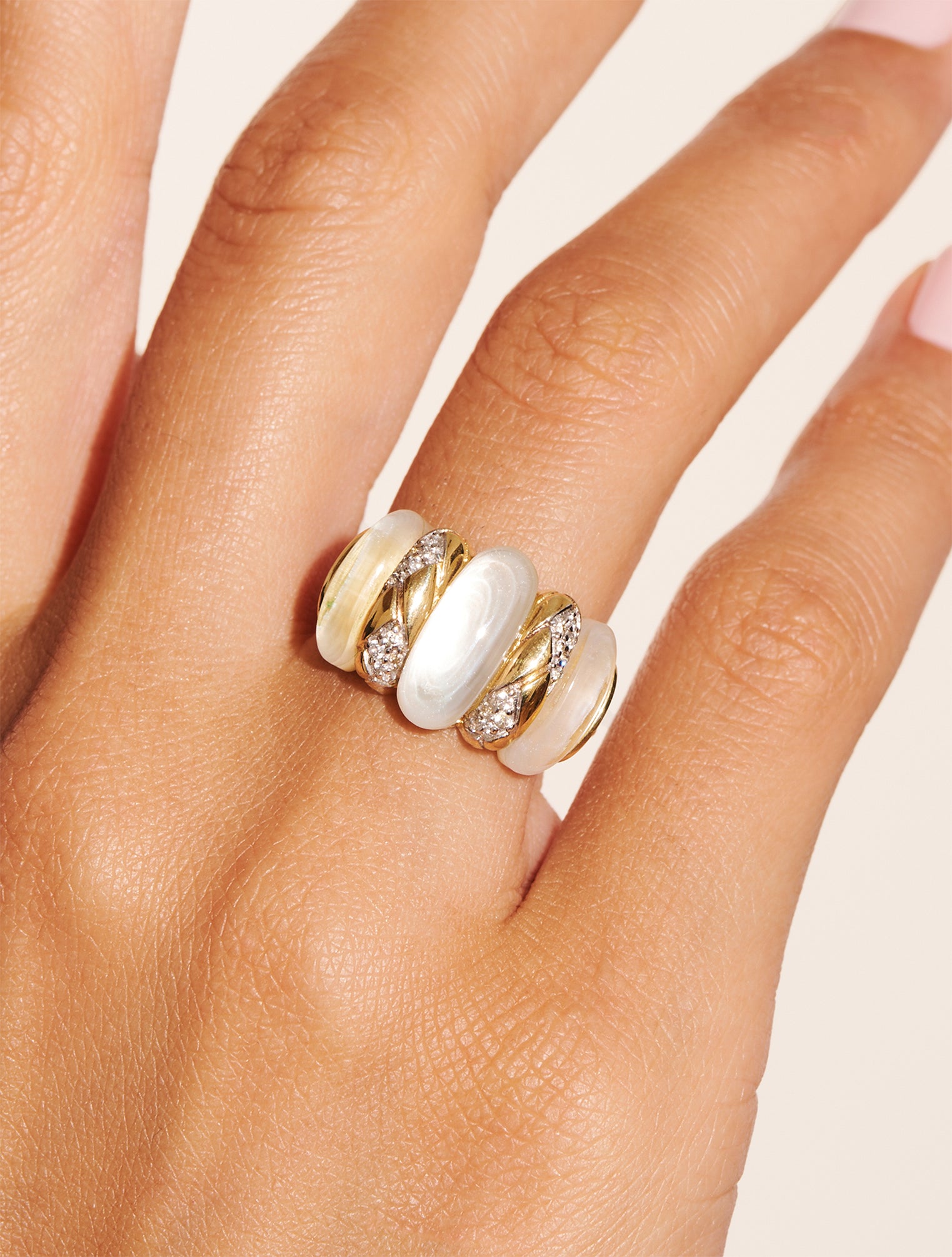 Création d’exception, la bague Oro en nacre est une pièce en 3 dimensions qui entremêle pierres en cabochon, zircons et dorures tressées. Généreuse par sa taille, par sa minutie et par son style néo-maya, elle va couronner votre doigt d’une touche à la fois chic et ethnique ! Sable doré ou festival d’été, journée ou soirée, elle ira où vous irez !