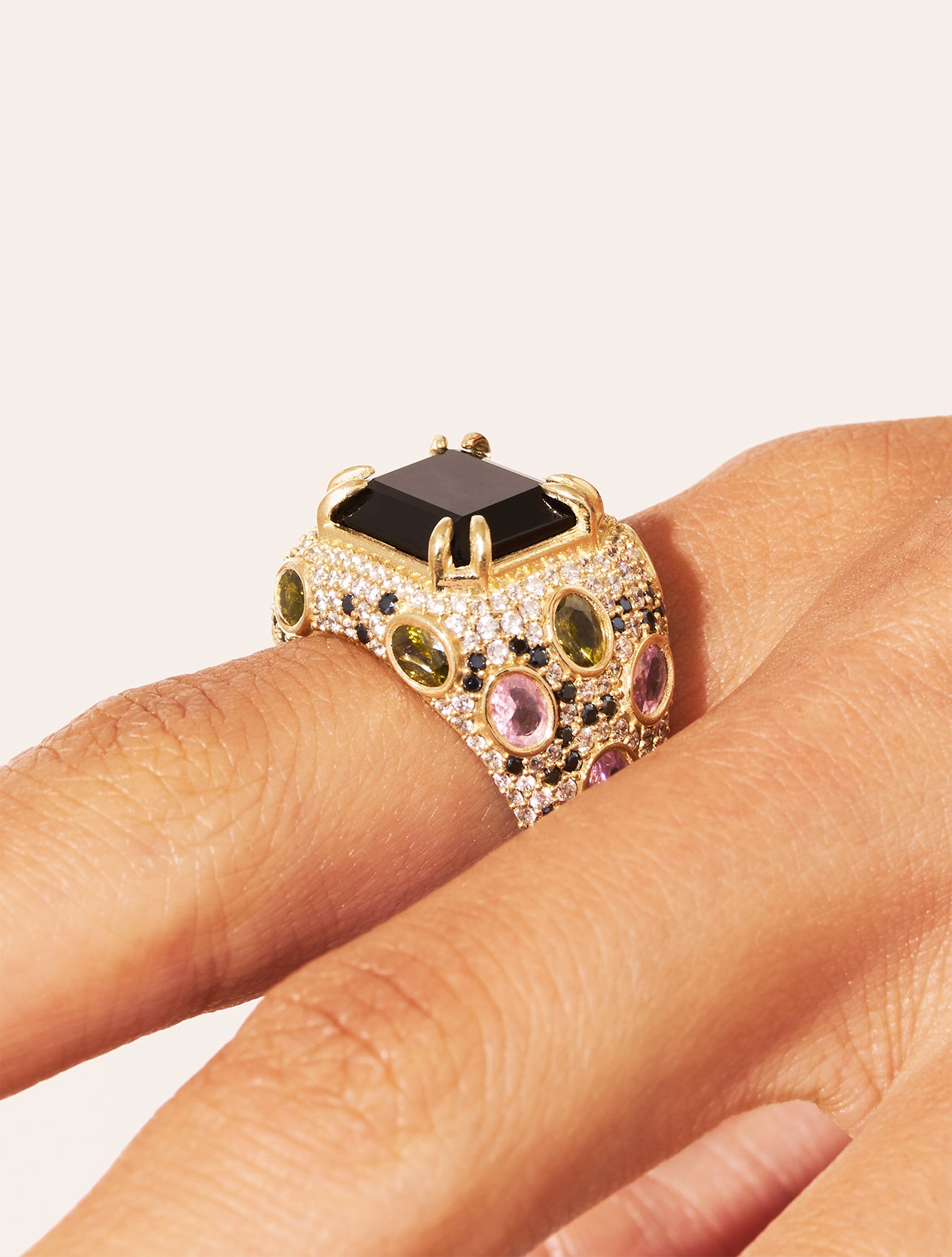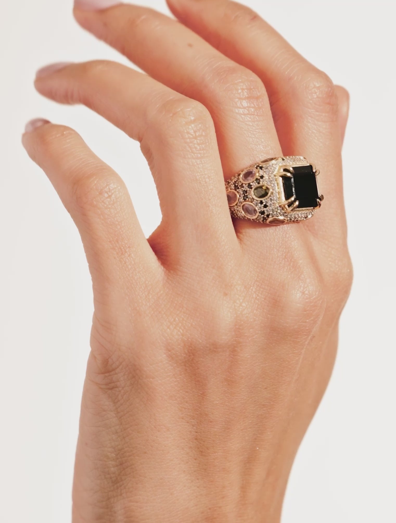 Bijou de caractère, la bague Panthère quartz coloré noir est un élan de beauté. Autour de sa pierre centrale, les zircons kaki & rose de tailles et teintes variées dessinent une mosaïque féline, tachetée de lumière. Entre éclat et artisanat, chacun de ses détails semble être prêt à bondir et à captiver. Portée sur main nue, elle aimante les regards. Impossible pour elle et pour vous de passer inaperçues.