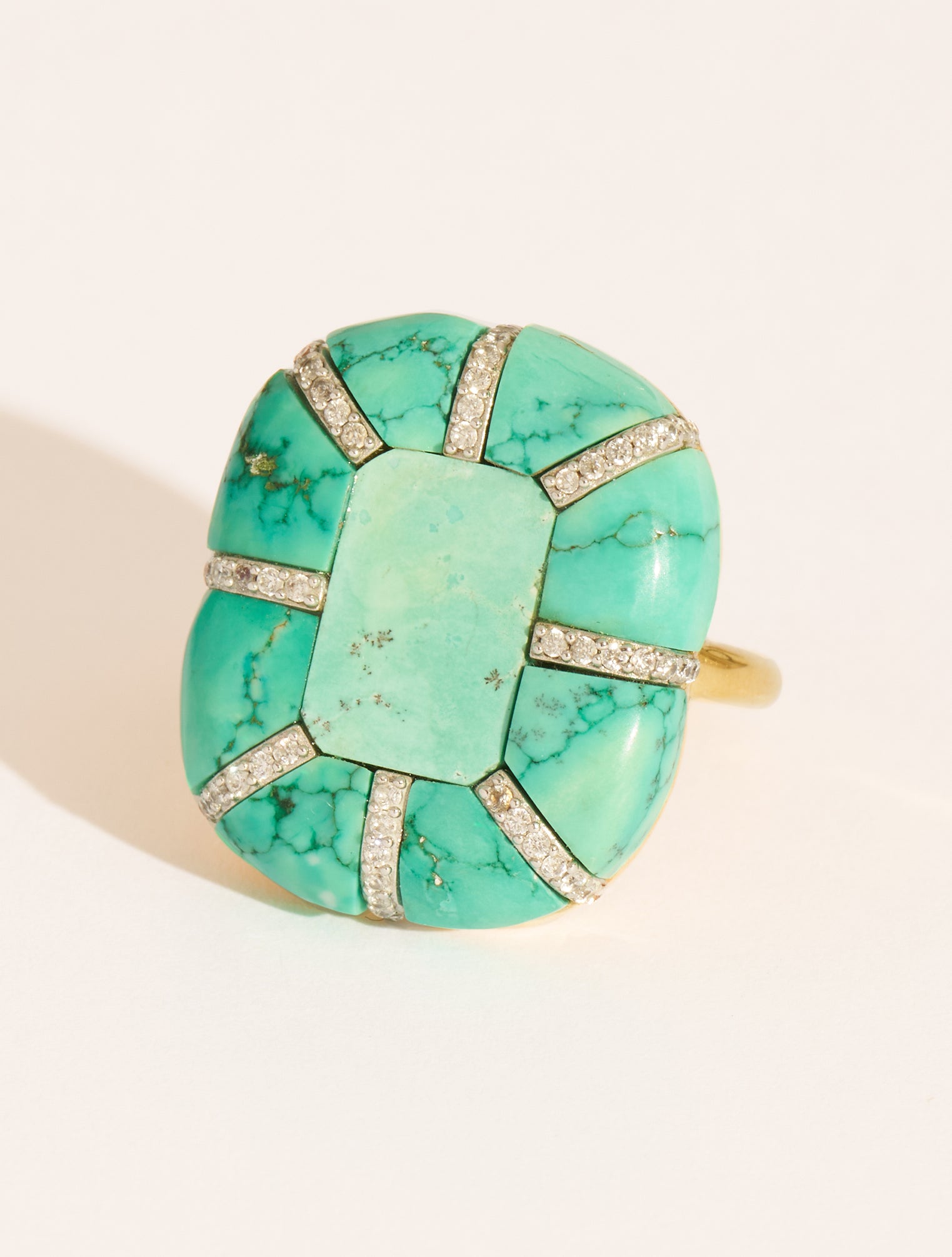 Courbes généreuses, lignes hexagonales, détails travaillés ; la somptueuse bague Reem en Turquoise est autant une prouesse technique qu'une merveille esthétique. En empruntant ses formes XXL à celles d’une fleur en pleine éclosion, elle laisse rayonner son savoir-faire exceptionnel, ses multiples zircons et ses fines pierres naturelles. Découpées neuf fois puis polies à la main, ces cabochons mettent ainsi royalement en avant les reflets, textures, tonalités et particularités de ce bijou hors du commun.