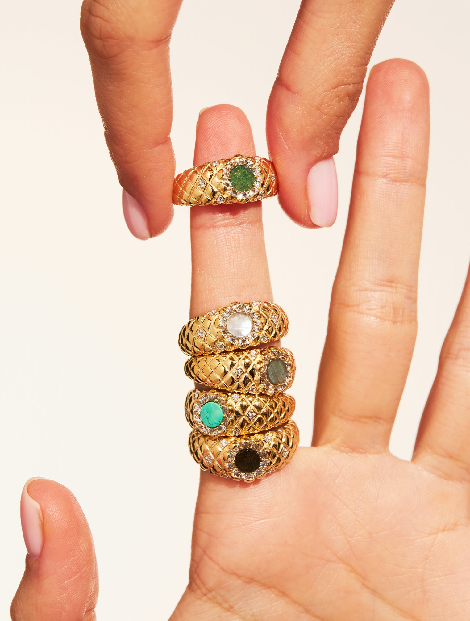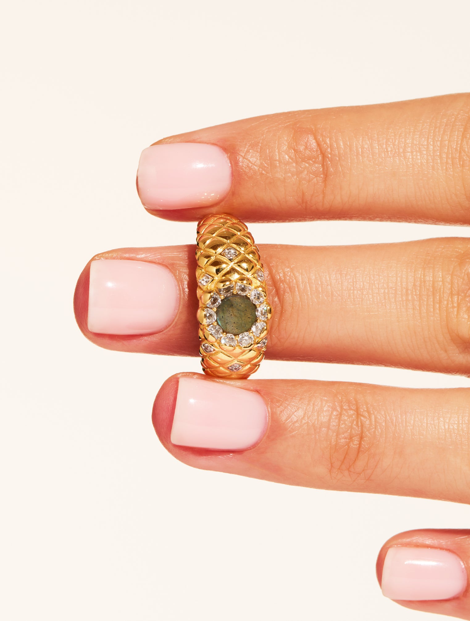 La bague texturée Rive d’Or en Labradorite incarne la fusion parfaite entre matière et lumière, entre structure et fluidité. Confectionnée entièrement à la main, cette création facettée mêle dorure et texture sur l’ensemble de sa silhouette. Au centre, une pierre ronde déploie ses reflets et s’entoure d’une constellation de zircons étincelants.