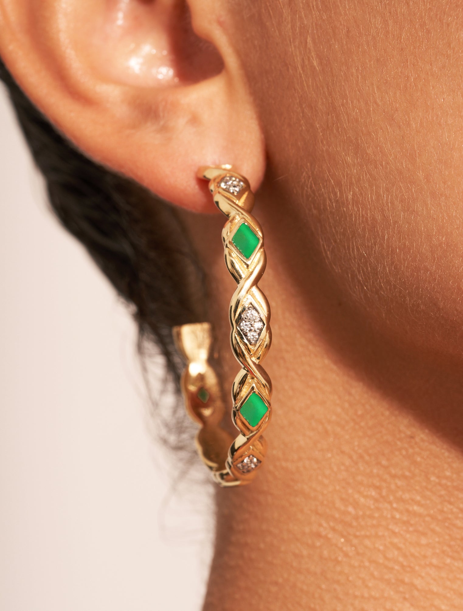 Unique, tel est le second prénom de ces magnifiques créoles Sani en Onyx vert. Bien que nos boîtes à bijoux renferment déjà de nombreuses paires, aucune ne peut égaler la beauté de ces boucles si singulières.