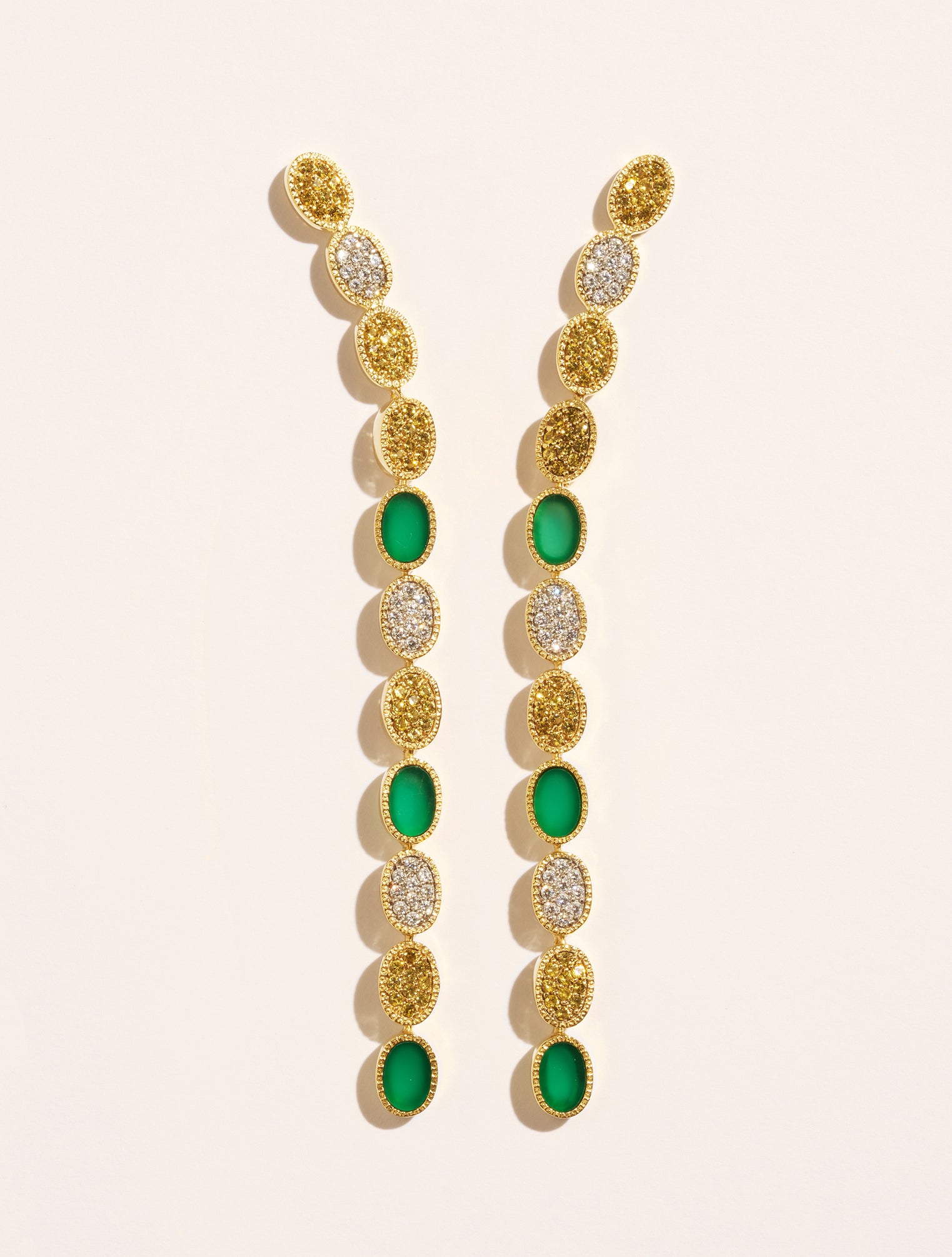 Tout en longueur, les boucles d'oreilles Sinaï, alternent les zircons blancs, jaunes et les fines pierres, soulignant le savoir-faire de nos artisans. Immaculées de ces précieuses matières premières, elles sont composées d'une cascade de onze petits ronds allongés, tous taillés et assemblés à la main les uns aux autres.