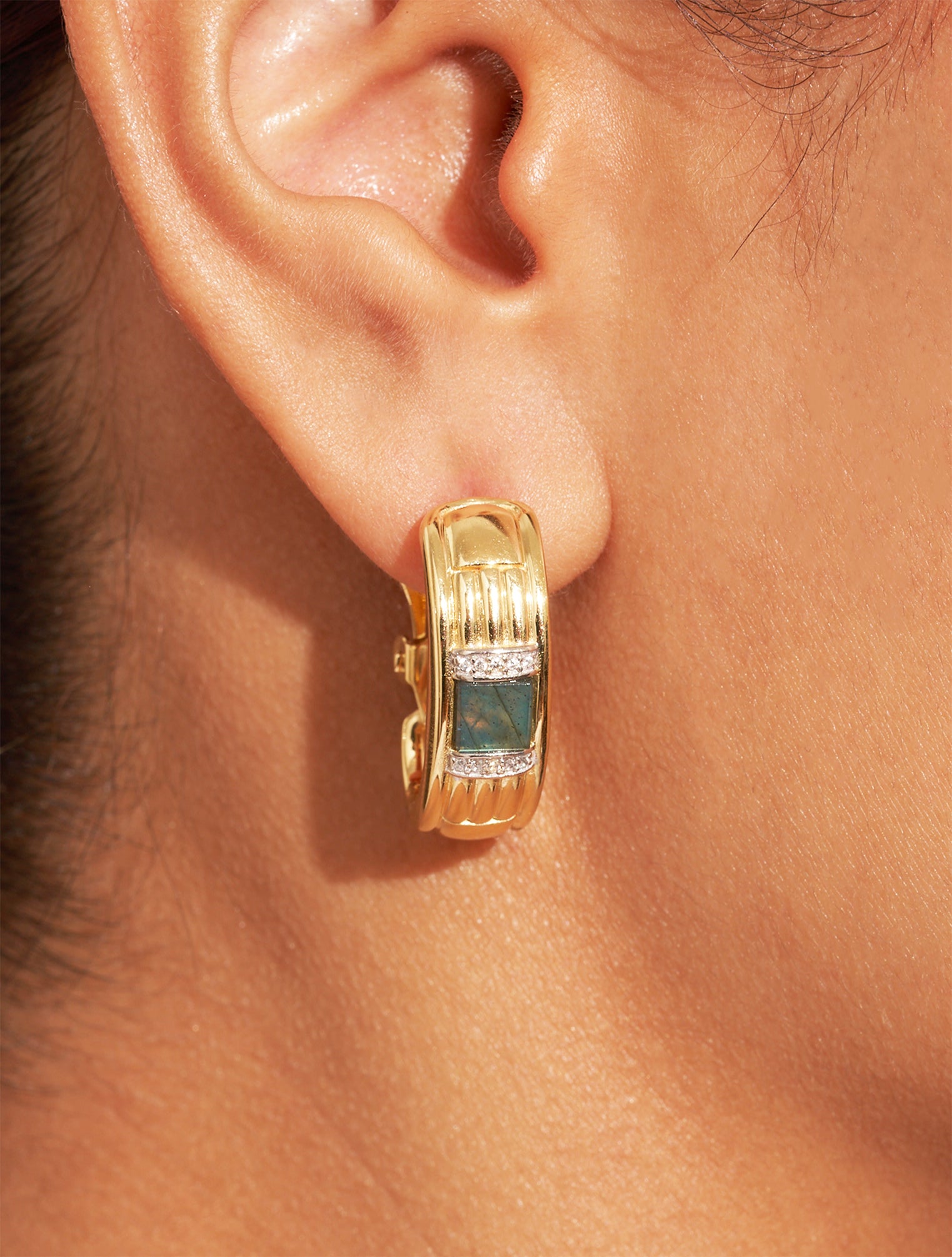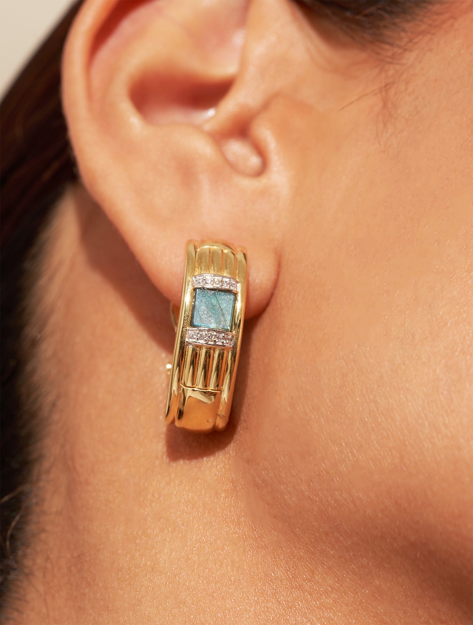 Créations incontournables de votre été, les boucles d’oreilles Amenza en Labradorite vont faire de l’ombre au soleil ! Chics et sophistiquées, elles revisitent le style rétro des sixties avec brio. Courbes féminines, détails somptueux, pierres naturelles, zircons scintillants : cette paire de boucles d’oreilles va faire parler d’elle toute la saison. Quelle que soit votre tenue ou votre coiffure, elles leur apporteront à coup sûr éclat et lumière !