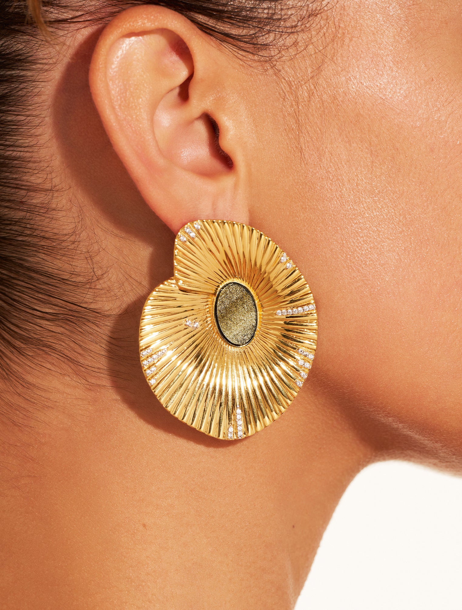 Majestueuses et solaires, les boucles d’oreilles coquillage Soleil Sauvage en Obsidienne dorée s’imposent par leur volume et leurs détails lumineux. Audacieusement sculpturales, elles réinterprètent l’océan avec des textures vibrantes et une pierre ovale centrale plate, soulignée par une constellation de zircons.