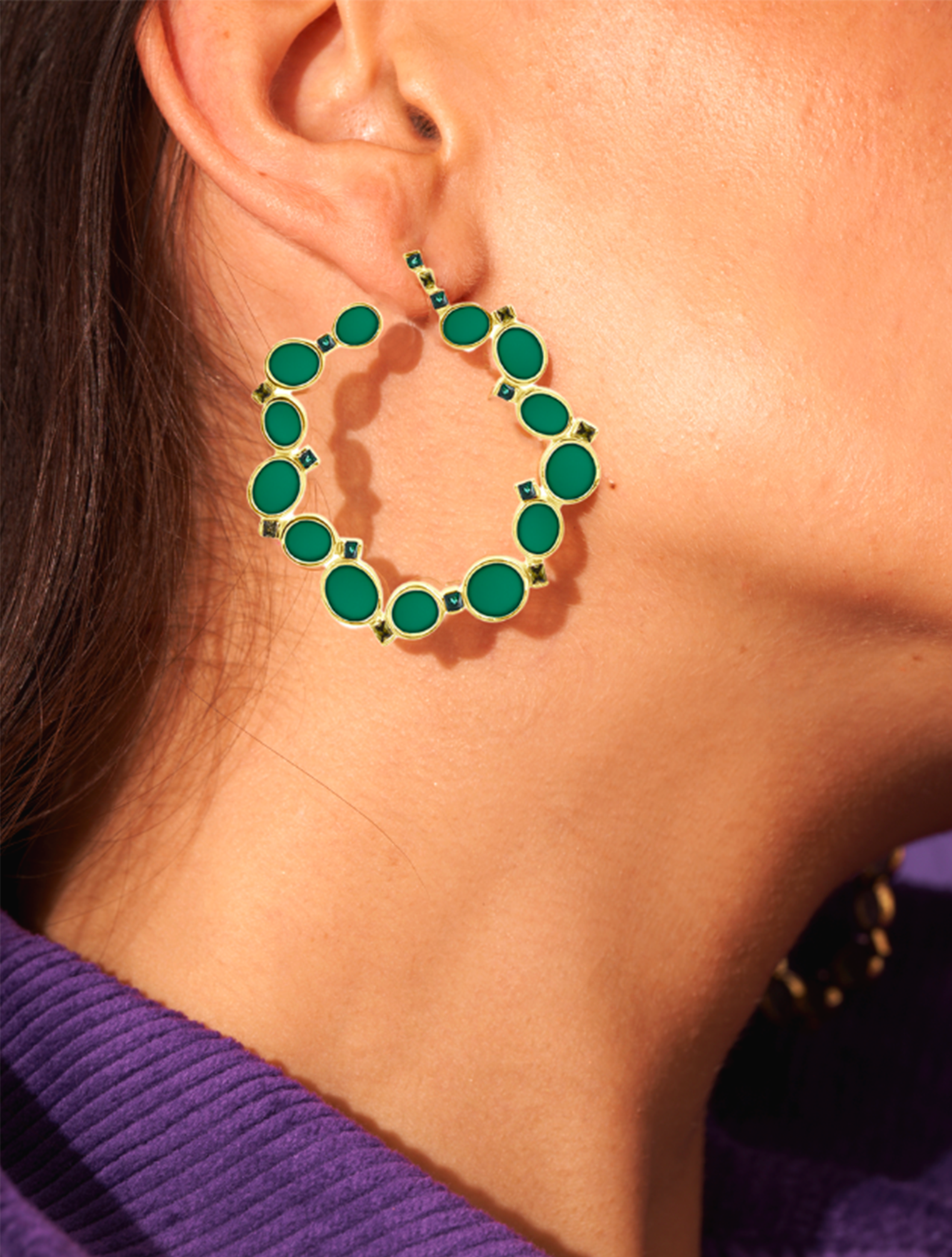 Travaillée à la main par nos artisans, la forme de ces petites créoles est d’une grande originalité : en passant à la fois par devant et derrière l’oreille, elle est visible de tous les côtés. Elle n’est pas la seule puisque son association de mini pierres ovales et de fins zircons l’est aussi.