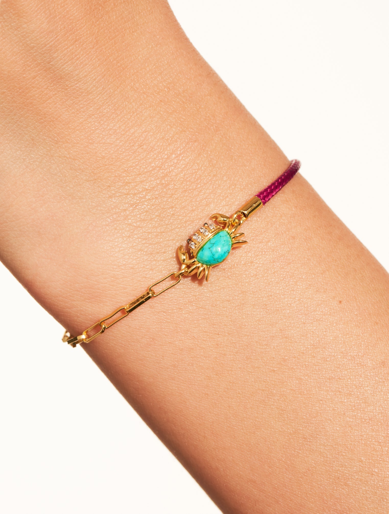 Associant chaîne fine et cordon soyeux coloré, le bracelet bi-matière Soleil Sauvage réinvente les symboles marins avec modernité. Coquillage, poisson et crabe se métamorphosent en pendentifs chics et graphiques, capturant l’essence de la nature avec une élégance inattendue. Loin d’être réservé à l’été, ce bijou est fait pour vivre sur votre poignet toute l’année.