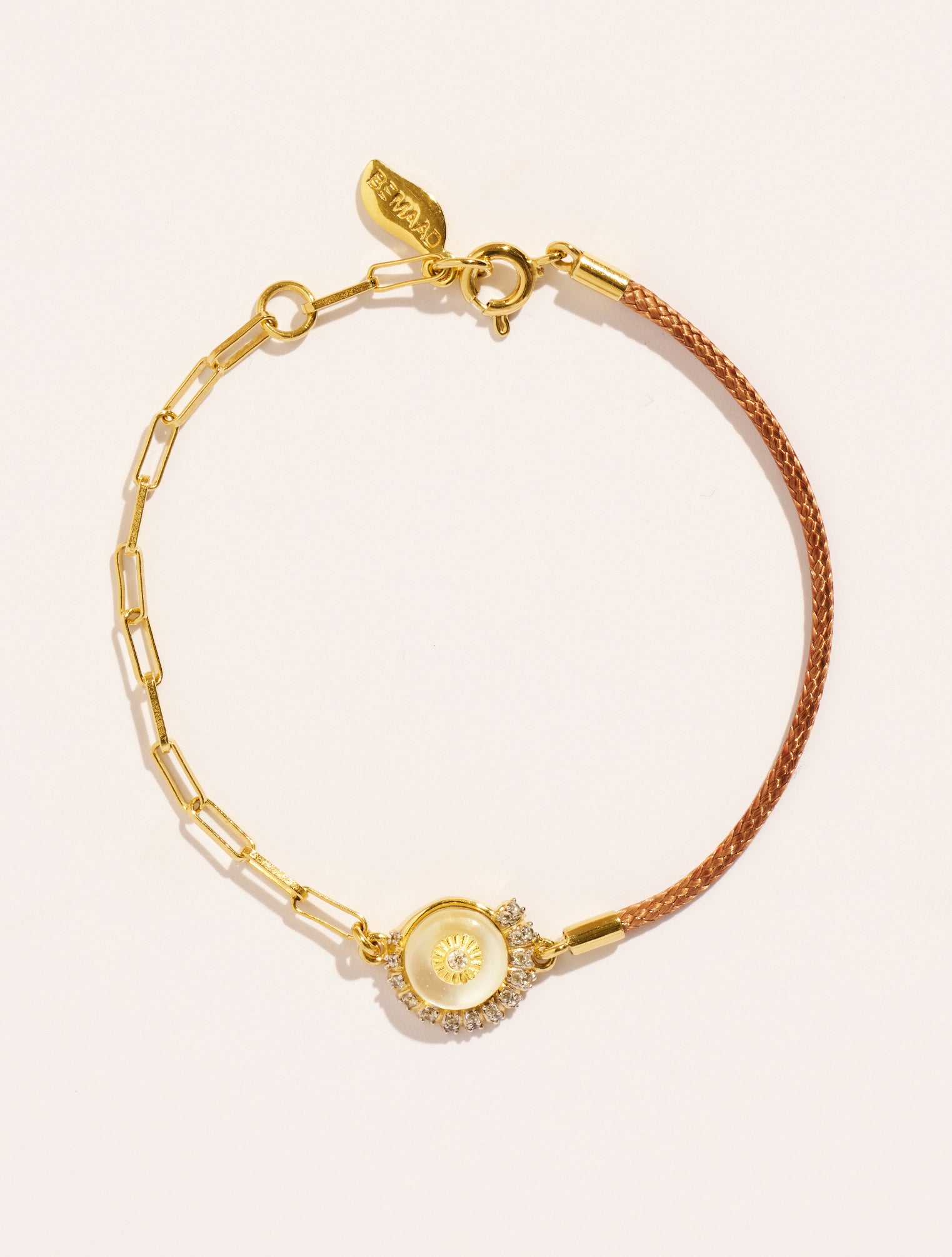 Associant chaîne fine et cordon soyeux coloré, le bracelet bi-matière Soleil Sauvage réinvente les symboles marins avec modernité. Coquillage, poisson et crabe se métamorphosent en pendentifs chics et graphiques, capturant l’essence de la nature avec une élégance inattendue. Loin d’être réservé à l’été, ce bijou est fait pour vivre sur votre poignet toute l’année.