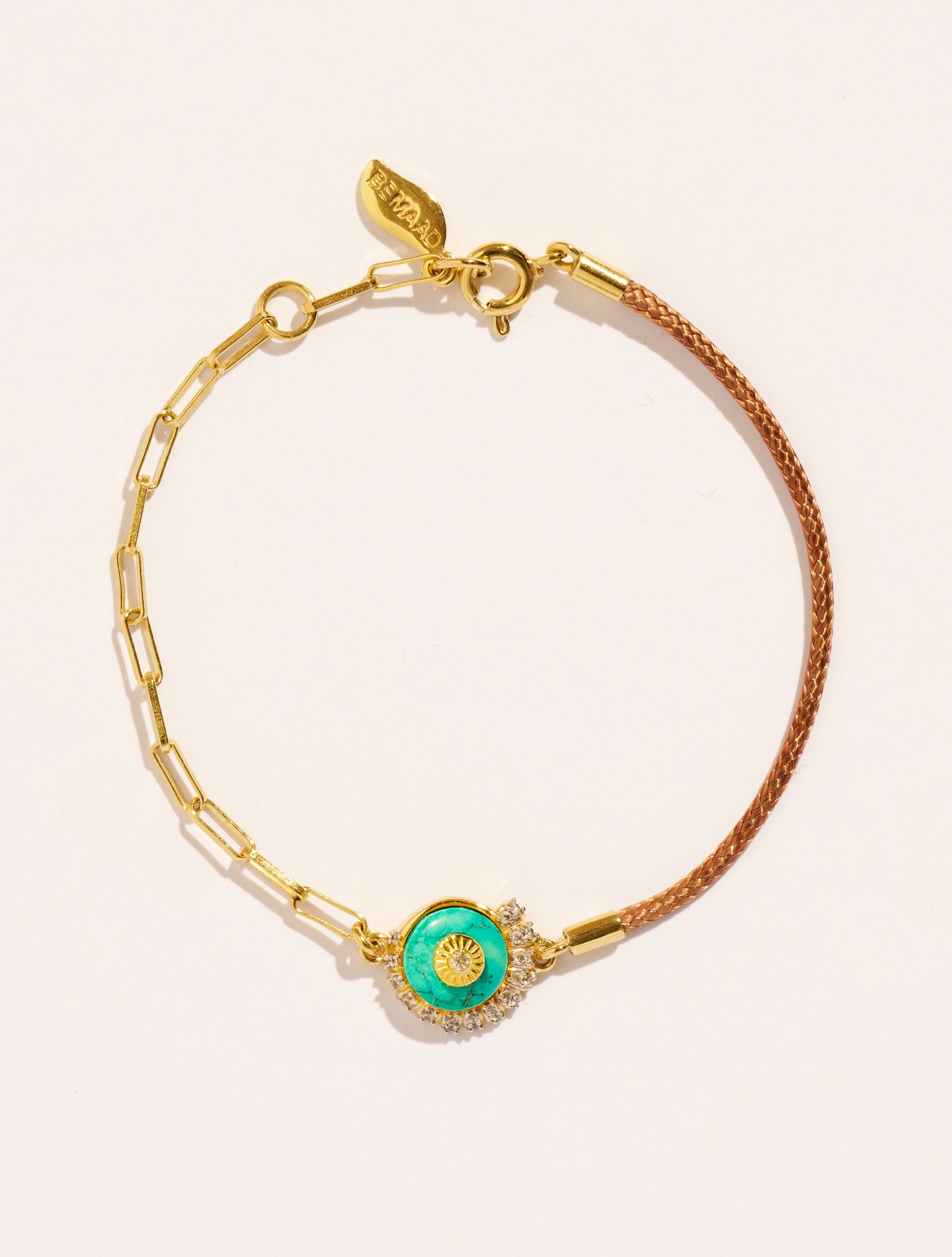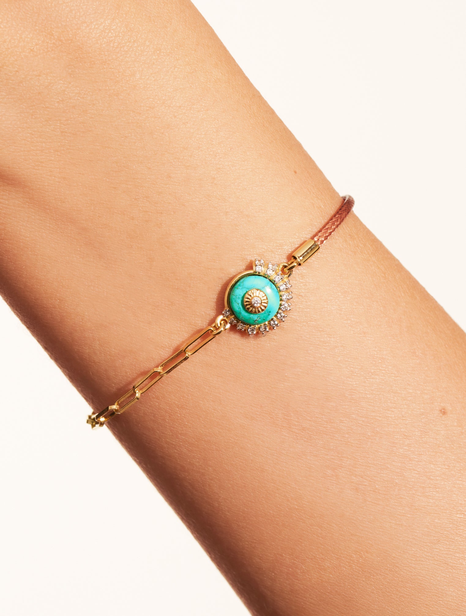 Associant chaîne fine et cordon soyeux coloré, le bracelet bi-matière Soleil Sauvage réinvente les symboles marins avec modernité. Coquillage, poisson et crabe se métamorphosent en pendentifs chics et graphiques, capturant l’essence de la nature avec une élégance inattendue. Loin d’être réservé à l’été, ce bijou est fait pour vivre sur votre poignet toute l’année.