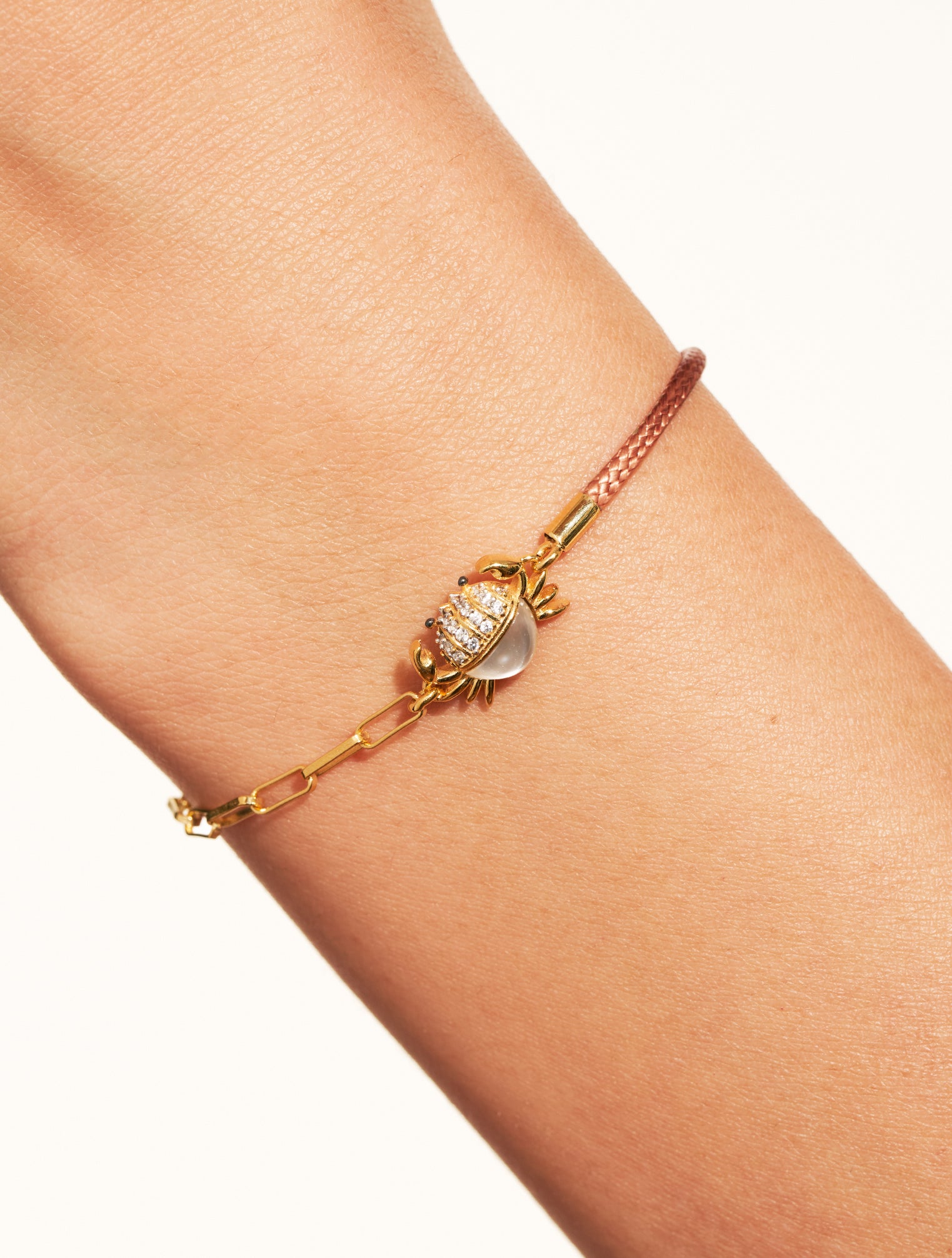 Associant chaîne fine et cordon soyeux coloré, le bracelet bi-matière Soleil Sauvage réinvente les symboles marins avec modernité. Coquillage, poisson et crabe se métamorphosent en pendentifs chics et graphiques, capturant l’essence de la nature avec une élégance inattendue. Loin d’être réservé à l’été, ce bijou est fait pour vivre sur votre poignet toute l’année.