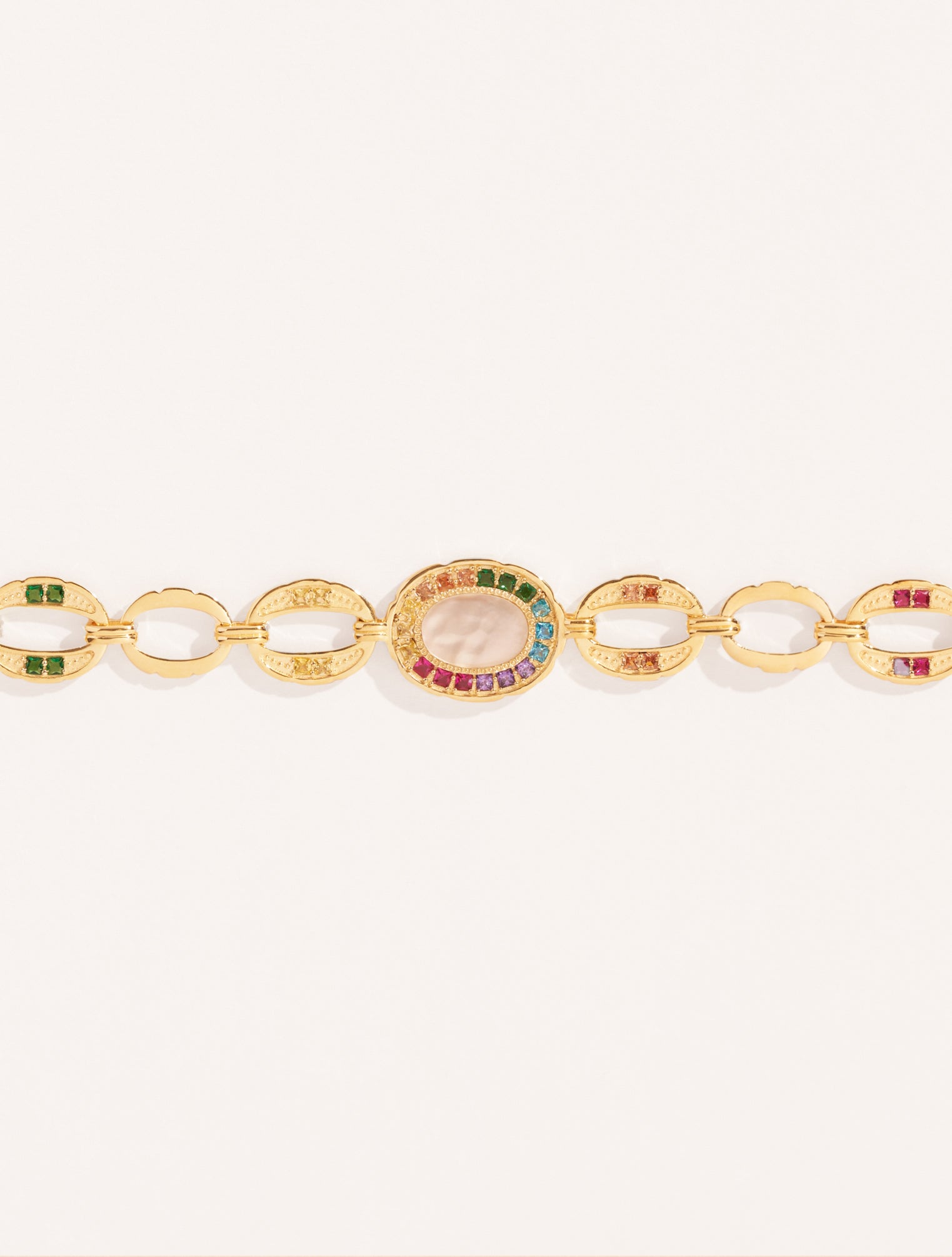 C’est tout en élégance que le bracelet Héra en nacre va faire virevolter en cadence ses maillons dorés. Fruit d’un précieux travail artisanal, sa chaîne ajustable qui rappelle la forme d’un médaillon est aussi originale qu’unique.