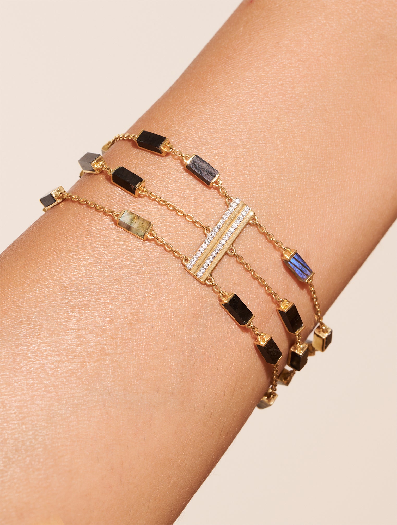Graphique mais discret, le bracelet Mara en Onyx Texturé et Labradorite est le parfait compagnon, en journée comme en soirée. Chaque détail de cette création a été joliment réfléchi et confectionné : symphonie de pierres, zircons blancs sertis un à un et maillons ultra fins.