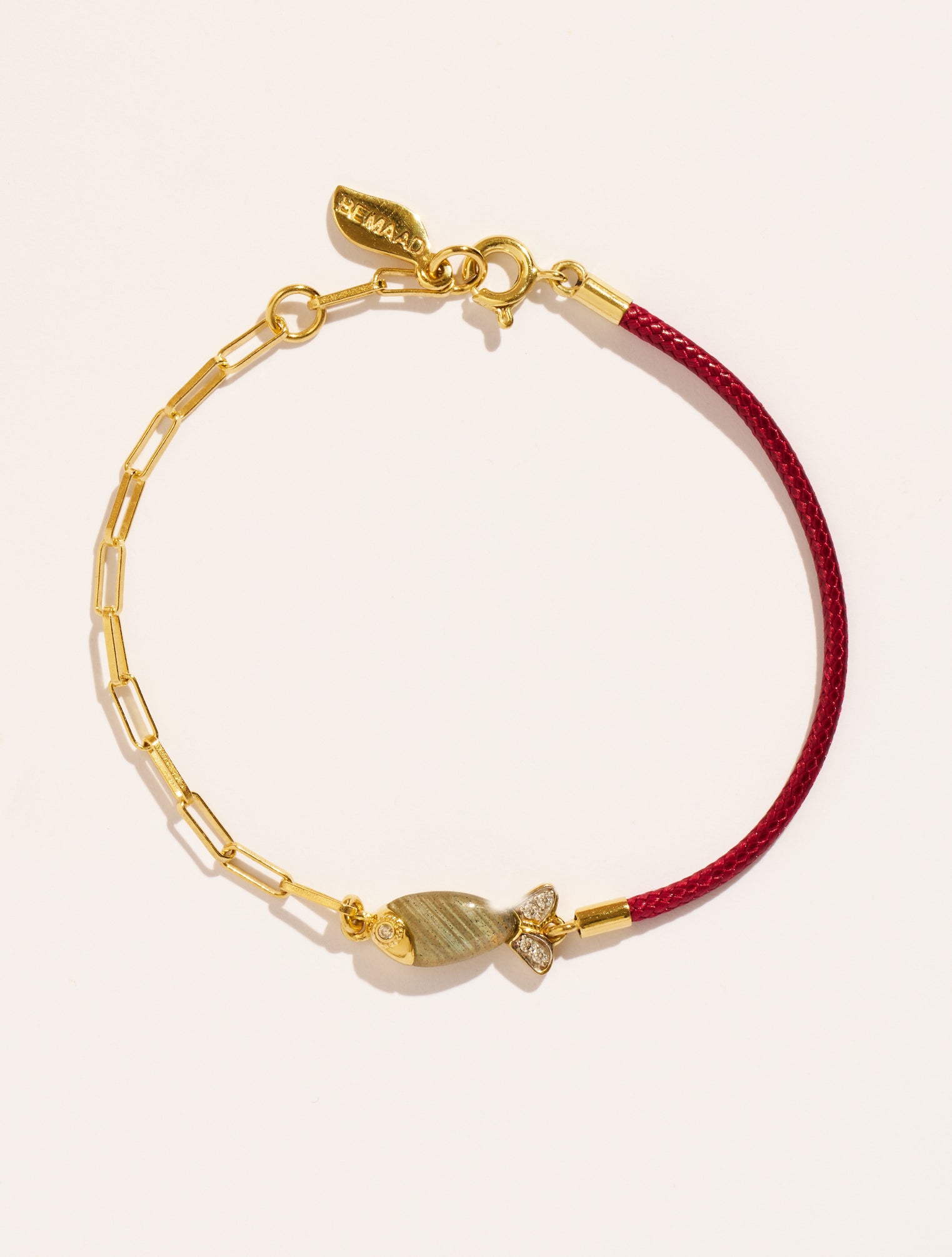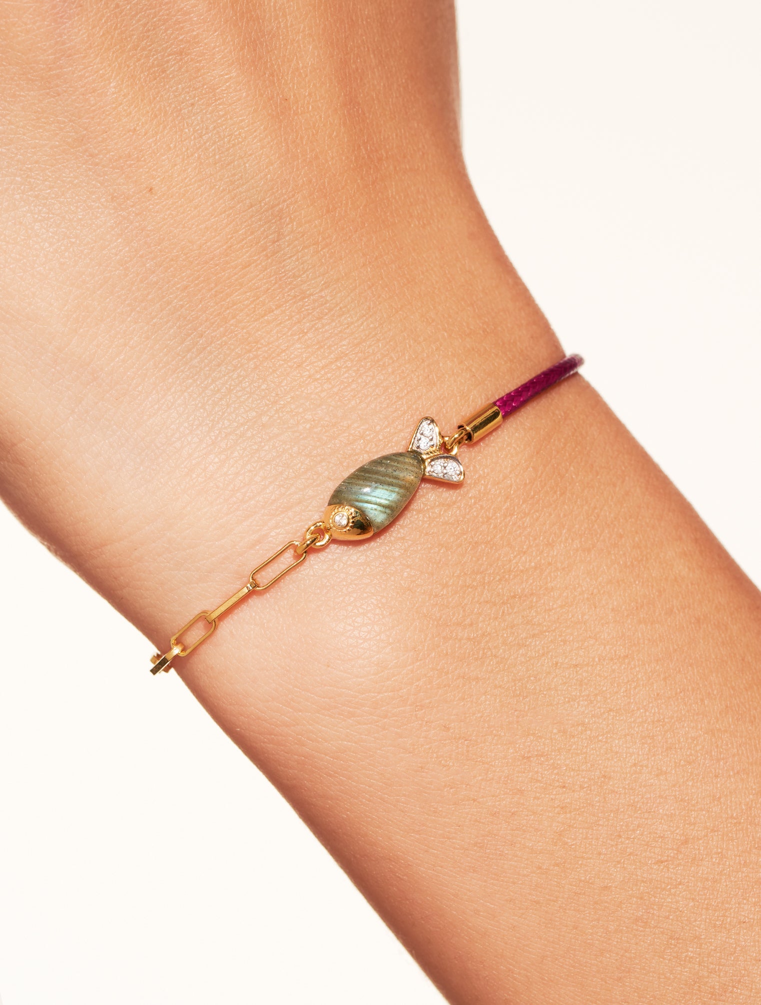 Associant chaîne fine et cordon soyeux coloré, le bracelet bi-matière Soleil Sauvage réinvente les symboles marins avec modernité. Coquillage, poisson et crabe se métamorphosent en pendentifs chics et graphiques, capturant l’essence de la nature avec une élégance inattendue. Loin d’être réservé à l’été, ce bijou est fait pour vivre sur votre poignet toute l’année.